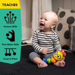 Encourage fine motor skills, sensory learning, and on-the-go engagement with the Baby Einstein Twist-a-Pal Cal Sensory Toy. This easy to grasp, handheld toy helps baby explore textures and learn cause and effect skills as they twist, press, spin, and slide the multisensory features on Cal the Caterpillar’s 4 segments. Twist and turn Cal’s head and body segments to hear clicking sounds or press the triangle button to see Cal’s face light up and play 30+ melodies and sounds. Tiny fingers will love to slide the beads on the 2-ring bead chaser, feel Cal’s 2 smooth antennae, press the bubble popper, or spin the roller ball to hear rattle sounds. Entertain baby on the go while promoting sensory exploration, fine motor skills, and cause and effect. For ages 6 months and up. Includes 2 AAA batteries. Wipes clean. Dimensions: 6.66 x 5 x 2.5 inches.