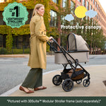 • Large canopy with pop-out visor and mesh panel helps provide sun protection and added airflow for warm-weather strolls with added stroller