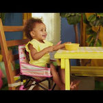 - Compact design easily folds to 5 x 15 inches; easy to clean with dishwasher safe tray and machine washable seat pad; includes a rear storage pocket for little essentials