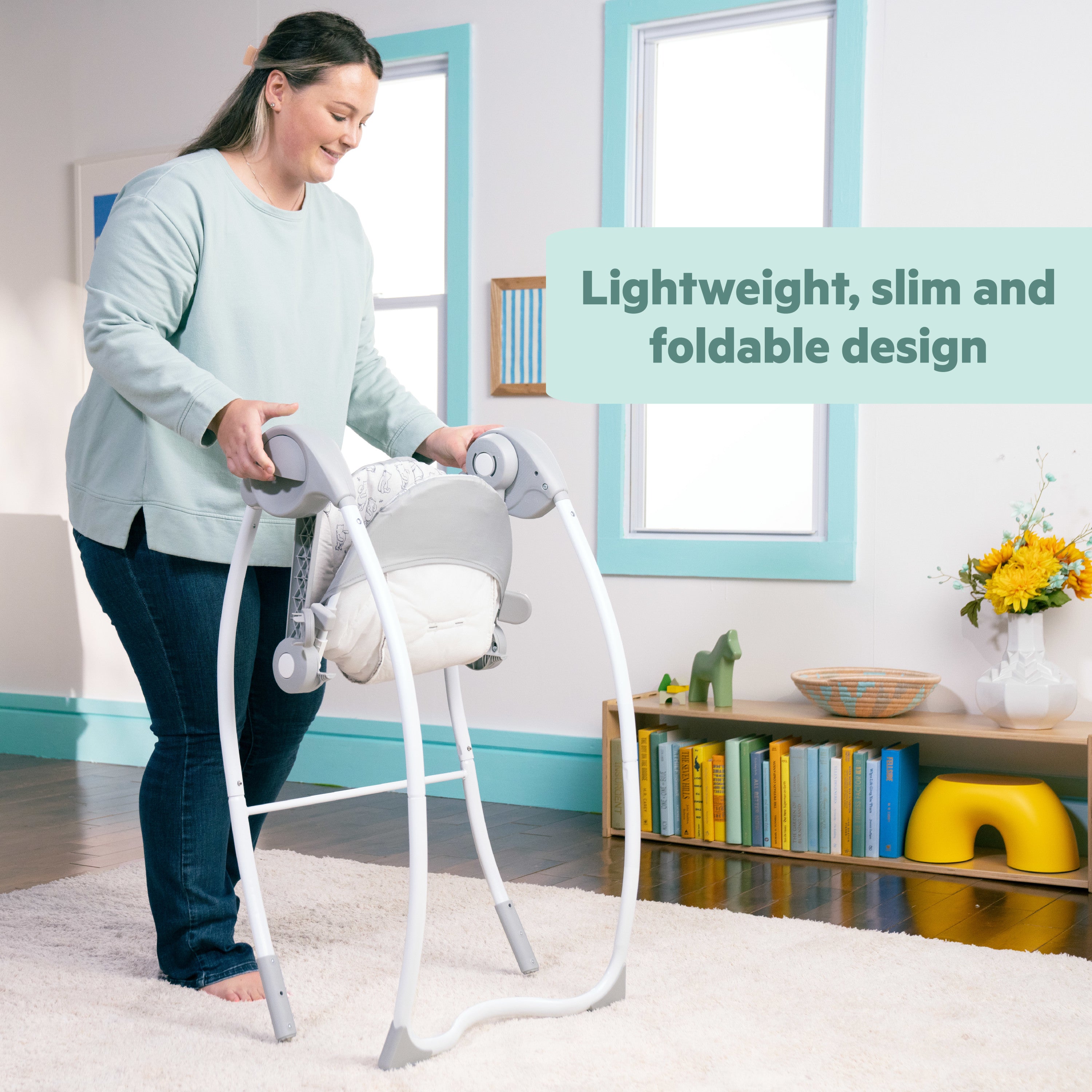 Swing into playtime with the Bright Starts Disney Baby Winnie the Pooh Classic Pals Milestone Swing! From newborns to active explorers, this swing offers two stages of fun as baby grows from reaching/batting to more advanced play. Younger babies can gaze up and reach for the dangling Tigger crinkle toy & sun plush toy with tags on the overhead toy bar. Older babies can grasp and interact with the bead chaser and spinning mirror toy on the lower activity bar. Keep baby calm and engaged with 6 swing speeds and TrueSpeed weight-sensing technology. Includes a 30, 60, and 90-minute timer. Play Winnie the Pooh inspired melodies to entertain baby while they swing. Maximize safety and comfort with 2 recline positions and a secure 5-point harness. This milestone swing is easy to clean with removable fabrics and folds compactly for storage or travel! No tools required to assemble. Designed for babies up to 9 months or 20lb. Third-party tested and approved. 4 C batteries required (not included). Dimensions: 37.01 in (H) × 36.61 in (W) × 23.82 in (L)