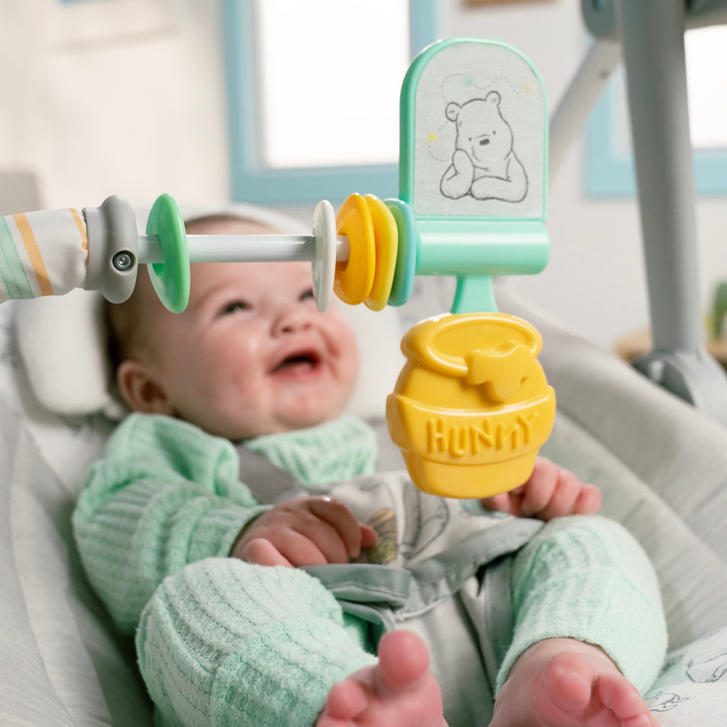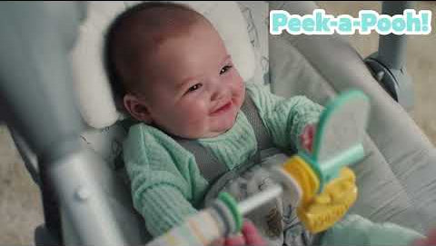 - Bright Starts Disney Baby Winnie the Pooh Milestone Swing features 2 stages of interactive play: overhead for reaching/batting and in-front for more advanced activities