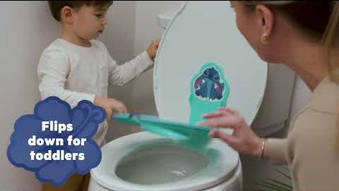 Make potty training a breeze with the Disney Junior Flip & Sit Potty Seat by Bright Starts – featuring your little one’s favorite mischievous alien, Stitch! This clever and playful seat attaches to your existing toilet with zero hassle. It takes seconds to install: just peel, stick, and let the fun begin! Encourage potty use with Stitch as your kiddo’s new bathroom buddy! Designed to fit most round, elongated, and D-shape toilets, this seat flips up and out of the way when grown-ups need to go. Perfect for small spaces, it’s sturdy, easy to clean, and there's no mess – just flush and go! To install, use the two adhesive strips to attach the potty training seat to the adult toilet lid. Four extra/replacement adhesive strips included. The super-stable design with anti-slip grips keeps your little one feeling safe and secure while they learn the ropes. Say goodbye to the messy potty chair – this training ring is easy to clean. Recommended for ages 18 months or up to 50 pounds, whichever comes first. The assembled dimensions are 8.1" (H) x 11.0" (W) x 15.7"(L).
