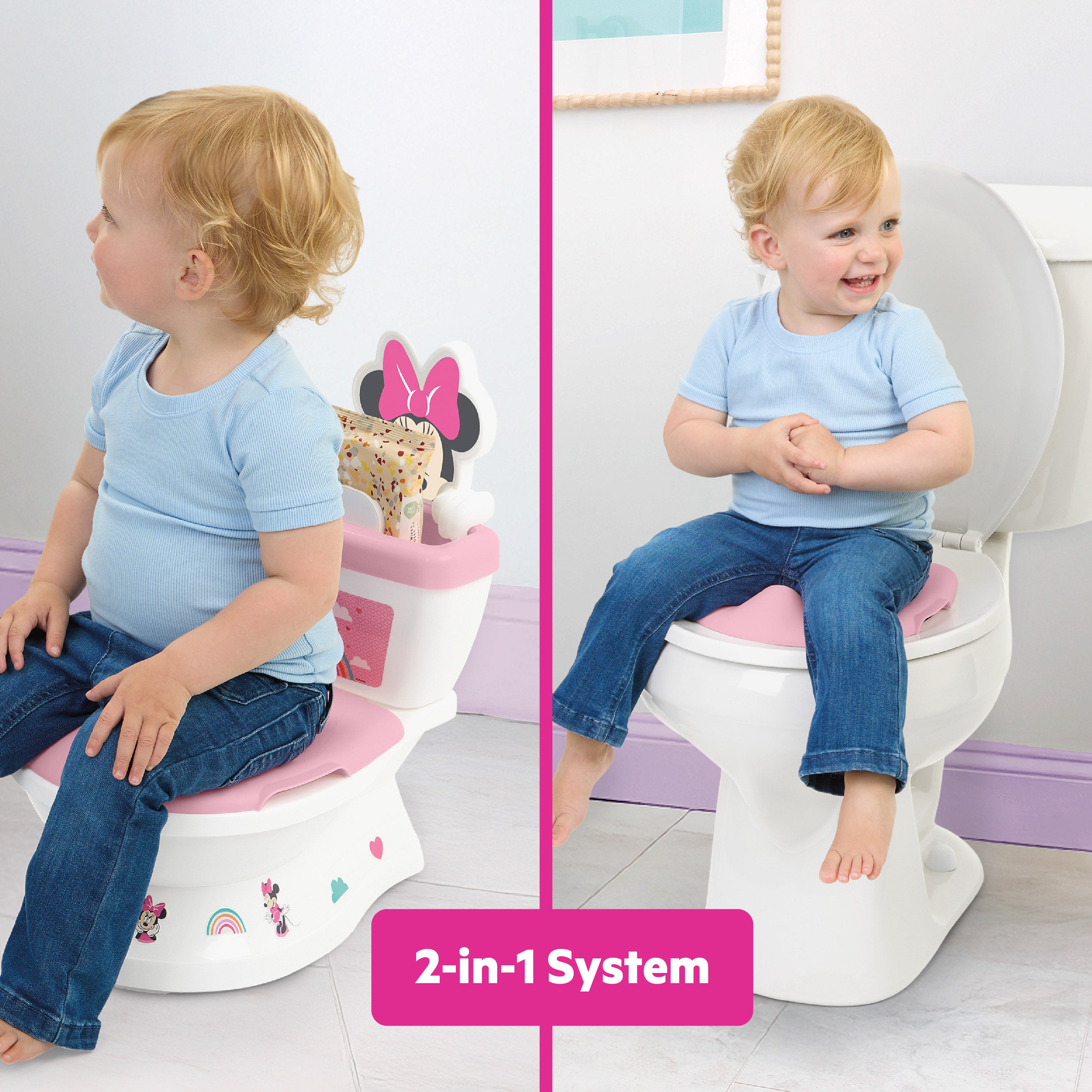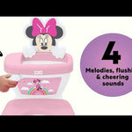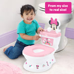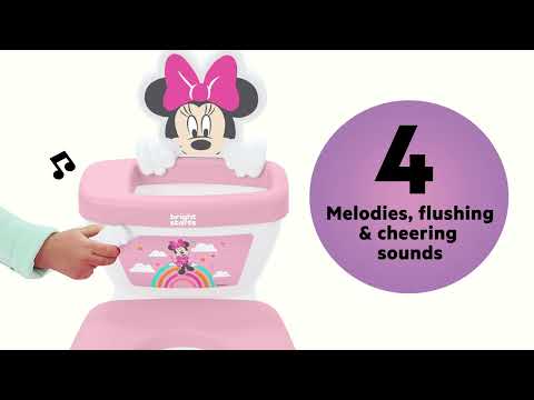 Make potty training a fun adventure with the Disney Baby Minnie My Size Potty by Bright Starts – featuring the magic of Minnie Mouse! Designed to engage toddlers and keep them excited about potty time, this 2-in-1 system grows with your little one through their potty training journey. Start with the floor potty chair that's just like a real toilet, then transition to the adult toilet with the removable seat. The realistic flushing sounds, cheering, and melodies will make every success feel like a big win. The 12 included Minnie Mouse-themed stickers let toddlers personalize their adorable pink and white training potty, adding even more fun to the process. With easy assembly and a removable pot for quick clean-ups, this toddler potty is as practical as it is playful! The potty training seat fits most round, elongated, and D-shape toilets. A built-in splash guard and handles ensure your little one feels safe and secure while learning the ropes. Plus, a convenient storage compartment keeps potty training essentials close at hand. Recommended for ages 18 months+ or up to 50 pounds.