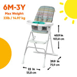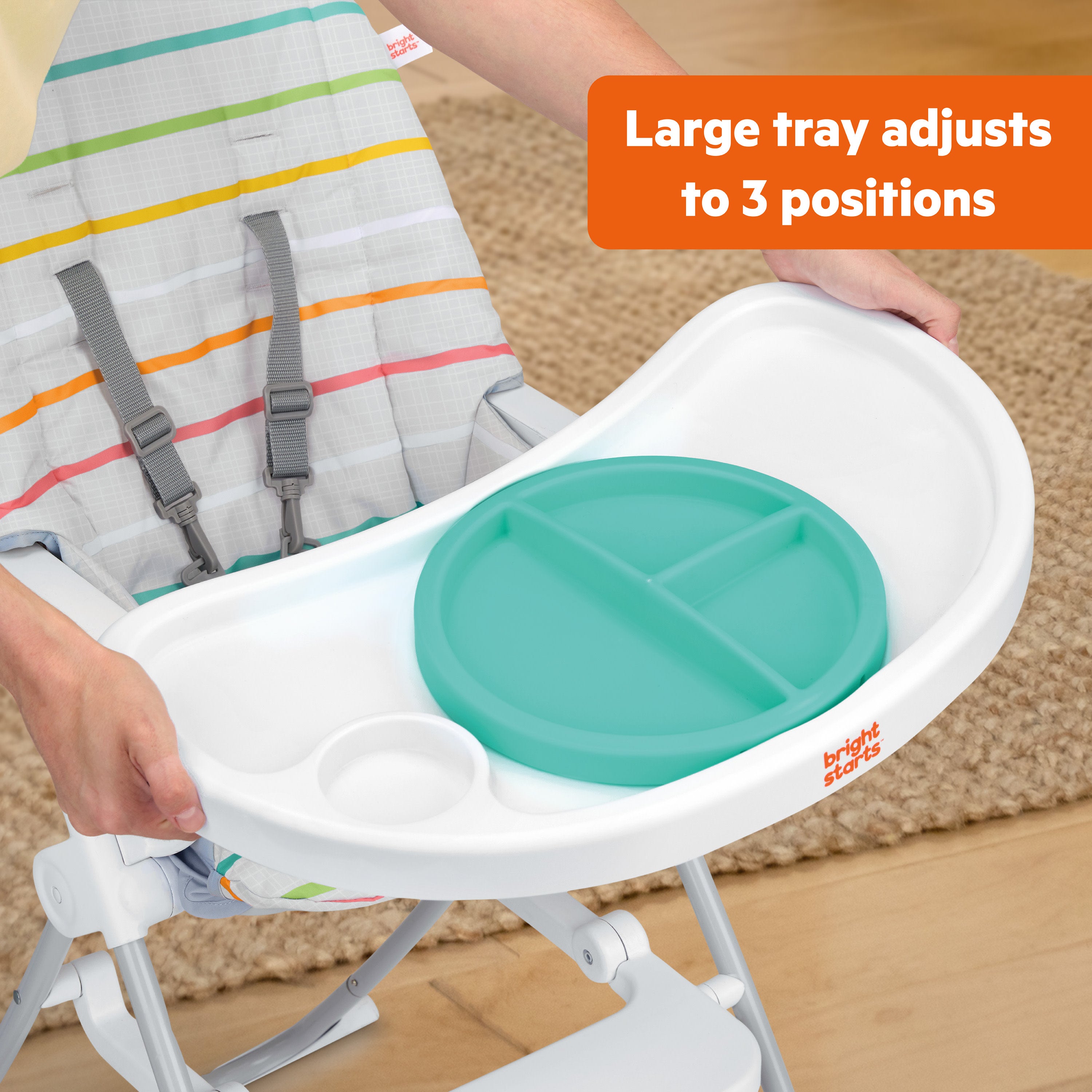 The Bright Starts Dine Delight Compact Folding High Chair delivers all the mealtime must-haves without taking over your space. This lightweight high chair features a compact design that’s easy to fold up and store out of the way. Encourage baby’s self-feeding skills with the unique 3-section Twist & Dine plate. It locks securely in place to prevent little ones from tossing it to the floor. Plus, it’s microwave safe for convenient meal prep! As baby grows, the large tray adjusts to 3 positions. And once mealtime is over, the tray attaches to the back of the chair for storage. Keep baby comfortable and secure with the 5-point safety harness and soft seat pad. When things get messy, cleanup is a breeze! The adorable striped seat pad of our Playful Paradise fashion is removable and machine washable. This baby high chair and toddler high chair is designed for ages 6 months to 3 years old or up to 33 pounds, whichever comes first. No tools required for assembly. Assembled dimensions: 22.05'' (W) x 29.28'' (D) x 38.78'' (H). Third party safety tested and approved. A great gift for new parents, grandparents, and caregivers who need space-saving functionality.