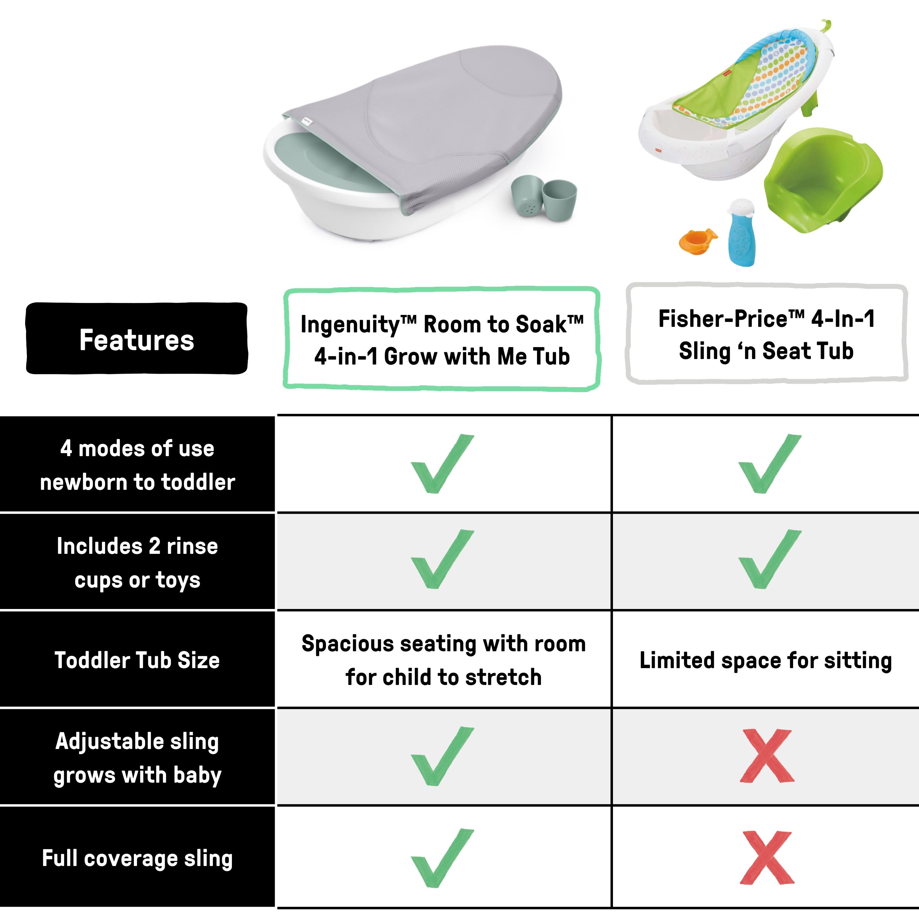 - Watch baby grow from fully supported baths to bath time fun all in the same comfy tub. The Ingenuity Room to Soak 4-in-1 Tub gives parents 4 simple stages to support baby as they grow into upright seated bathers.