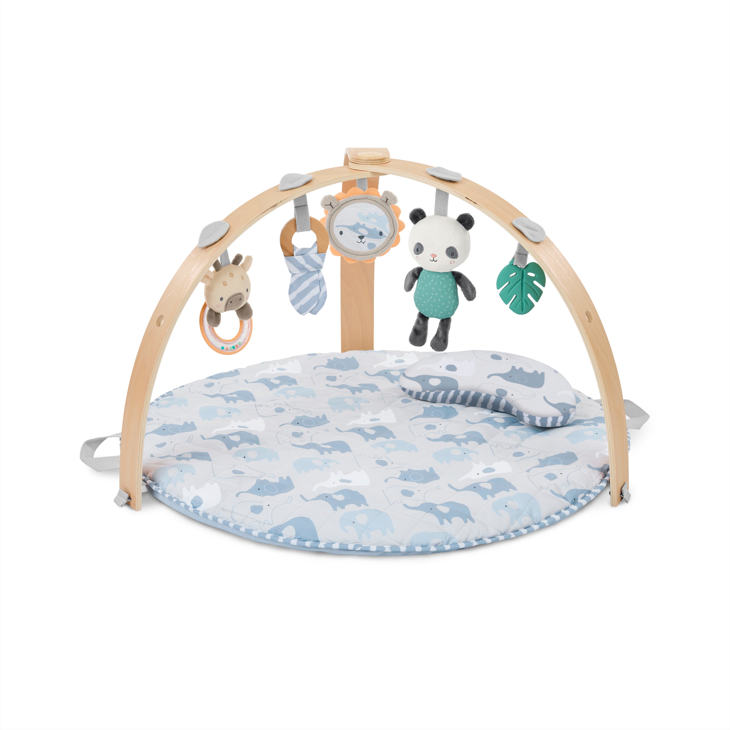 • Includes tummy time pillow, 5 detachable toys made of natural materials: silicone leaf toy, plush panda bear, wooden ring toy, lion mirror, and a giraffe bead rattle