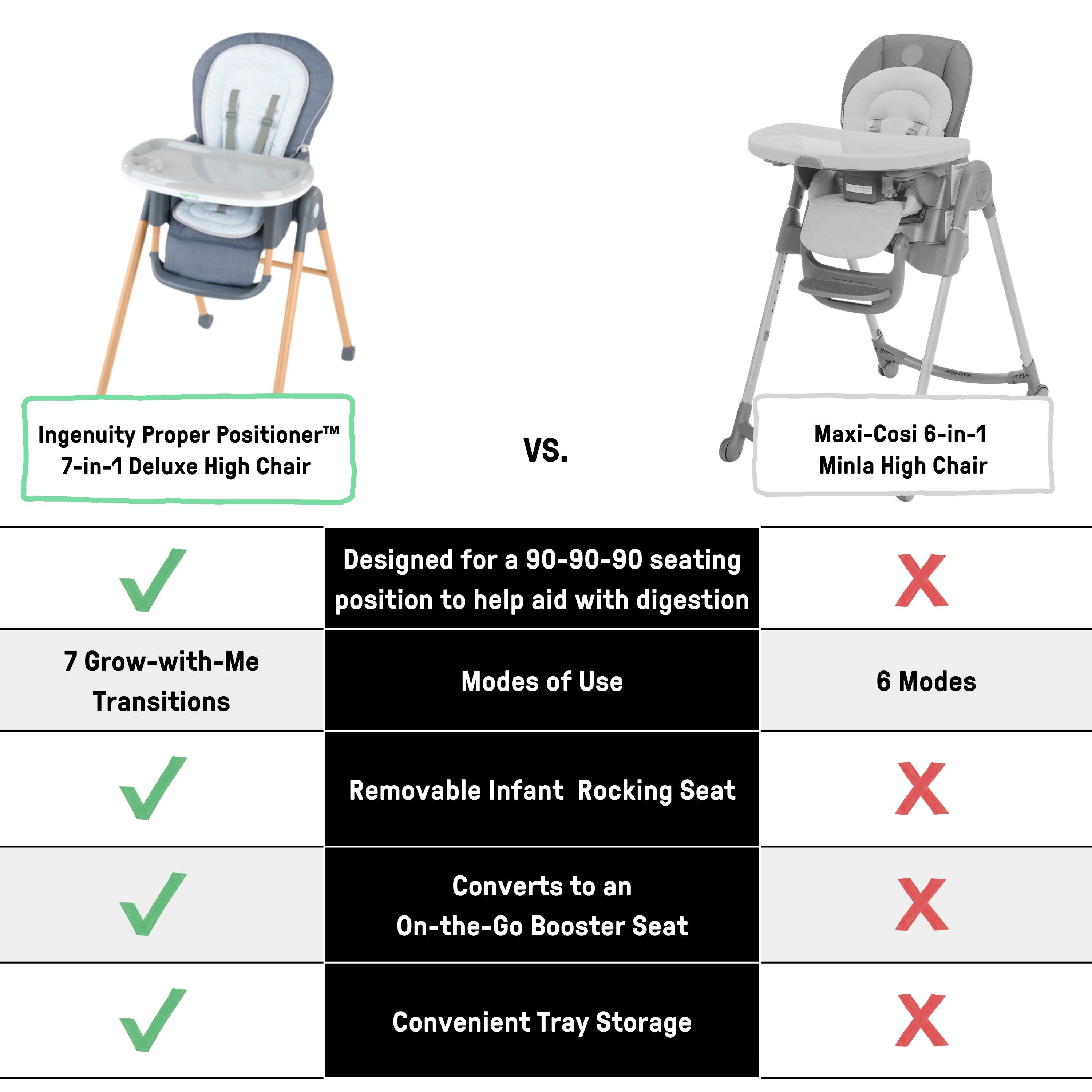 - The Ingenuity Proper Positioner Deluxe 7-in-1 High Chair puts baby in an optimum 90-90-90 feeding position. This chair features 7 grow-with-me stages of feeding to promote good posture for better digestion from newborn to toddler