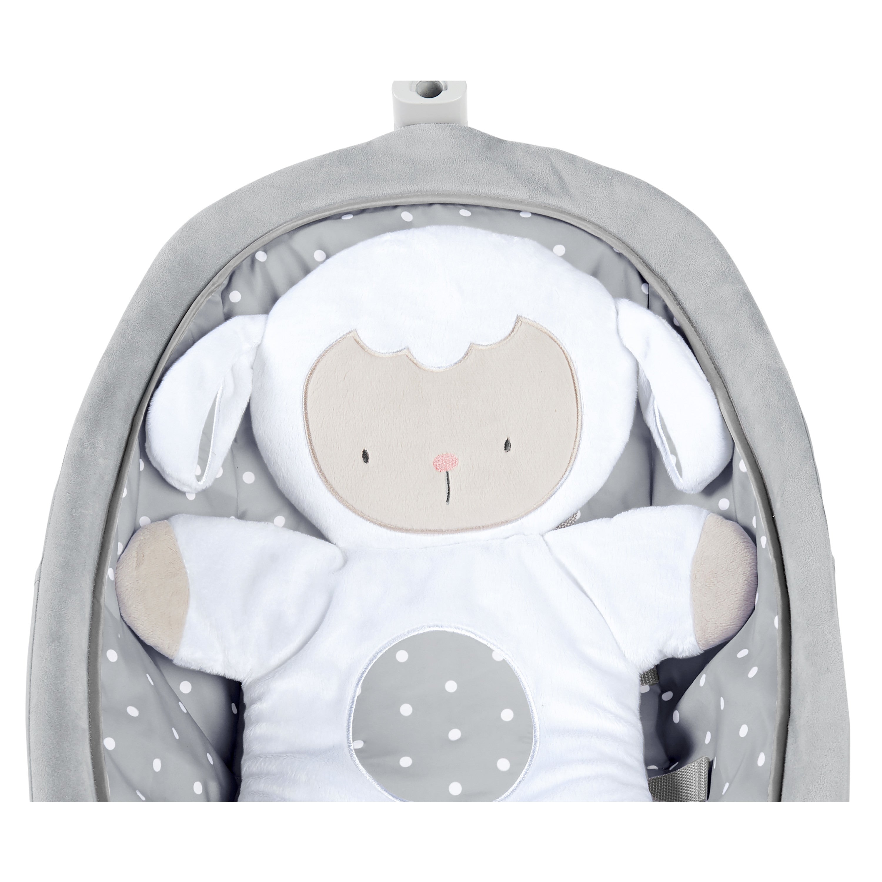 The Ingenuity Cuddle Lamb Rocking Seat gives your little one a secure, soothing place to rock or cuddle up. This lightweight 2-in-1 snuggly seat grows with baby from a newborn rocker to a toddler seat so your little one can enjoy for up to 30 months (or 40 pounds). A 5-point harness and 3 recline positions help keep baby secure and comfy. The lamb bolster can be removed for baby to lay on as a tummy time mat. 2 plush toys on the overhead toy bar help entertain. Powered by 3 size C batteries (not included), soothing vibrations, 12 tranquil melodies, and 4 nature sounds help calm the fuss away (with 25-minute auto shut-off). The neutral, modern design makes this a great gift for holidays and baby showers, and it fits right in with any home decor. For messes, simply remove the seat pad and bolster from the frame and toss in the wash. The foldable design allows you to take baby’s favorite seat on the go or store away when not in use. Assembled dimensions are 30.0" (H) x 18.5" (W) x 30.7" (D).