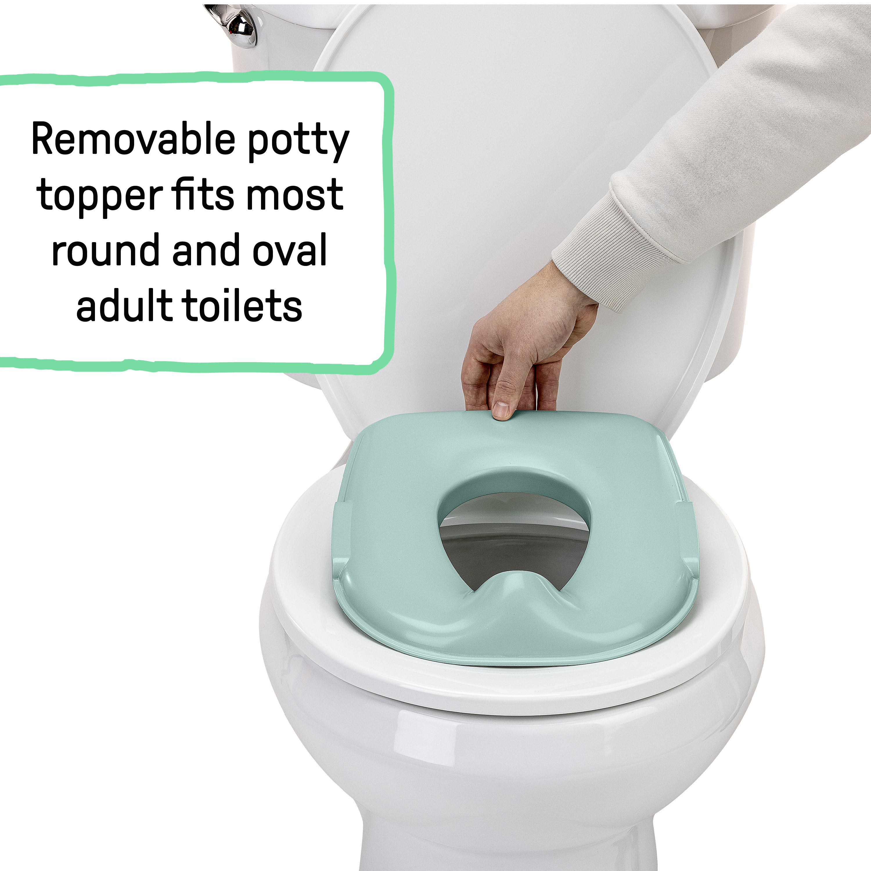 - When it's time to transition from the toddler potty to the adult toilet, simply remove the potty topper and place onto the adult-sized toilet. This topper includes integrated splash guard and handles and fits most round, elongated, and D-shape toilets