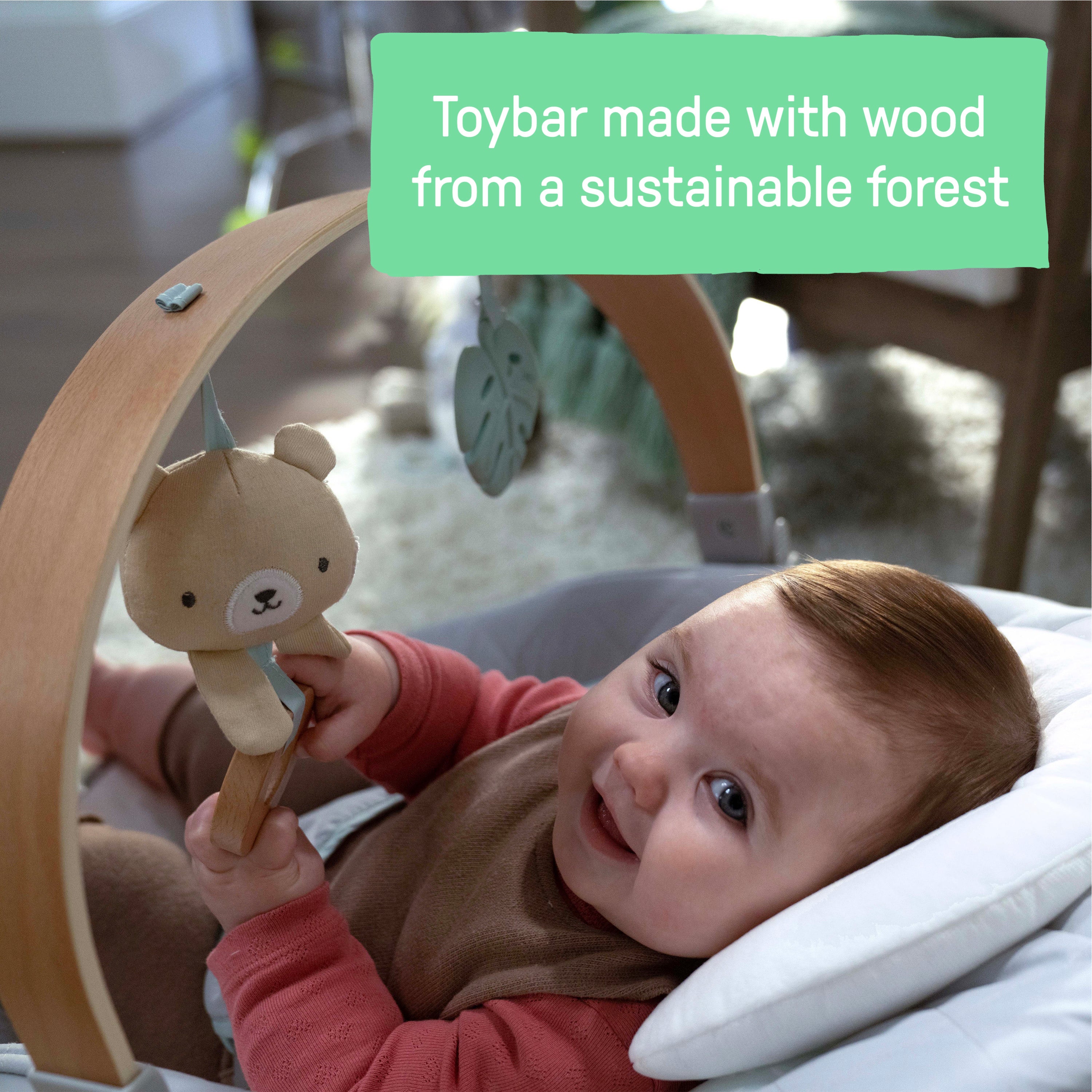 - The only bouncer that comes with a toy arch made with sustainably harvested birch wood; also features Nate the bear plush toy with a natural wood ring, and a silicone leaf-shaped toy