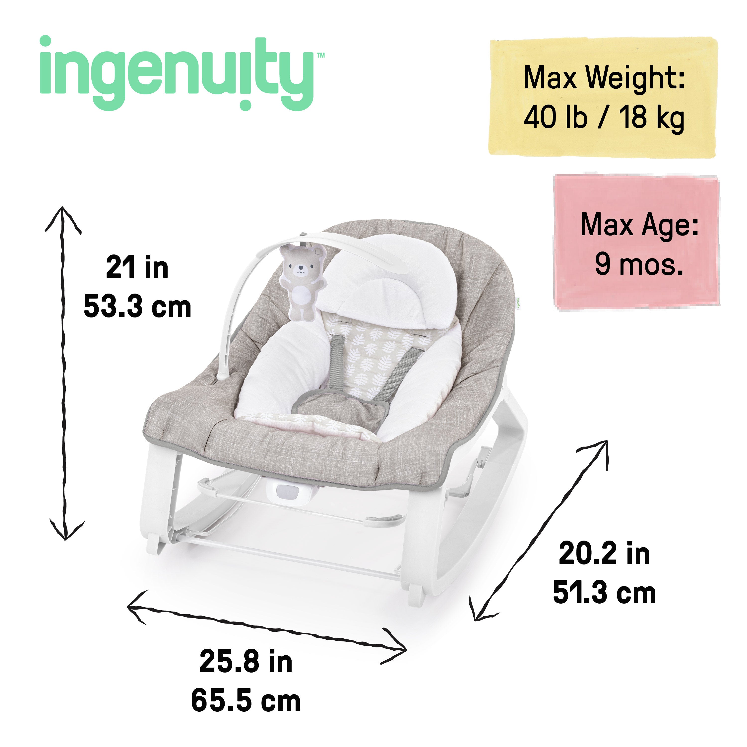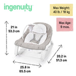 The best-selling Ingenuity Keep Cozy Baby Bouncer, Seat & Infant to Toddler Rocker grows with baby to be enjoyed for years. A new parent “must-have” with over half a million units sold, this versatile baby rocker and bouncer from the #1 manufacturer of bouncers is designed in the USA and gives you a second set of hands while baby sits comfortably in your sight. Third party tested and approved, the Keep Cozy features 3 modes in 1: bouncing, rocking, or convert it to a stationary seat for your toddler with the kickstand at the rear. Packed with features like soothing vibrations powered by 1 C battery (not included), two reclining positions for baby’s comfort and a removable infant bolster that helps newborns sit securely. Includes a detachable plush bear hanging toy for playtime at home or on the go. Neutral design blends into any home décor. Seat pad and bolster are machine washable. Accommodates children up to 40 pounds, and makes a great add to your baby registry. Assembled dimensions are 23.62" (H) x 19.69" (W) x 28.74" (L). This is the #1 bouncer, Circana, Retail Tracking Service, Bouncers, U.S. dollar sales, January-November 2023 combined.