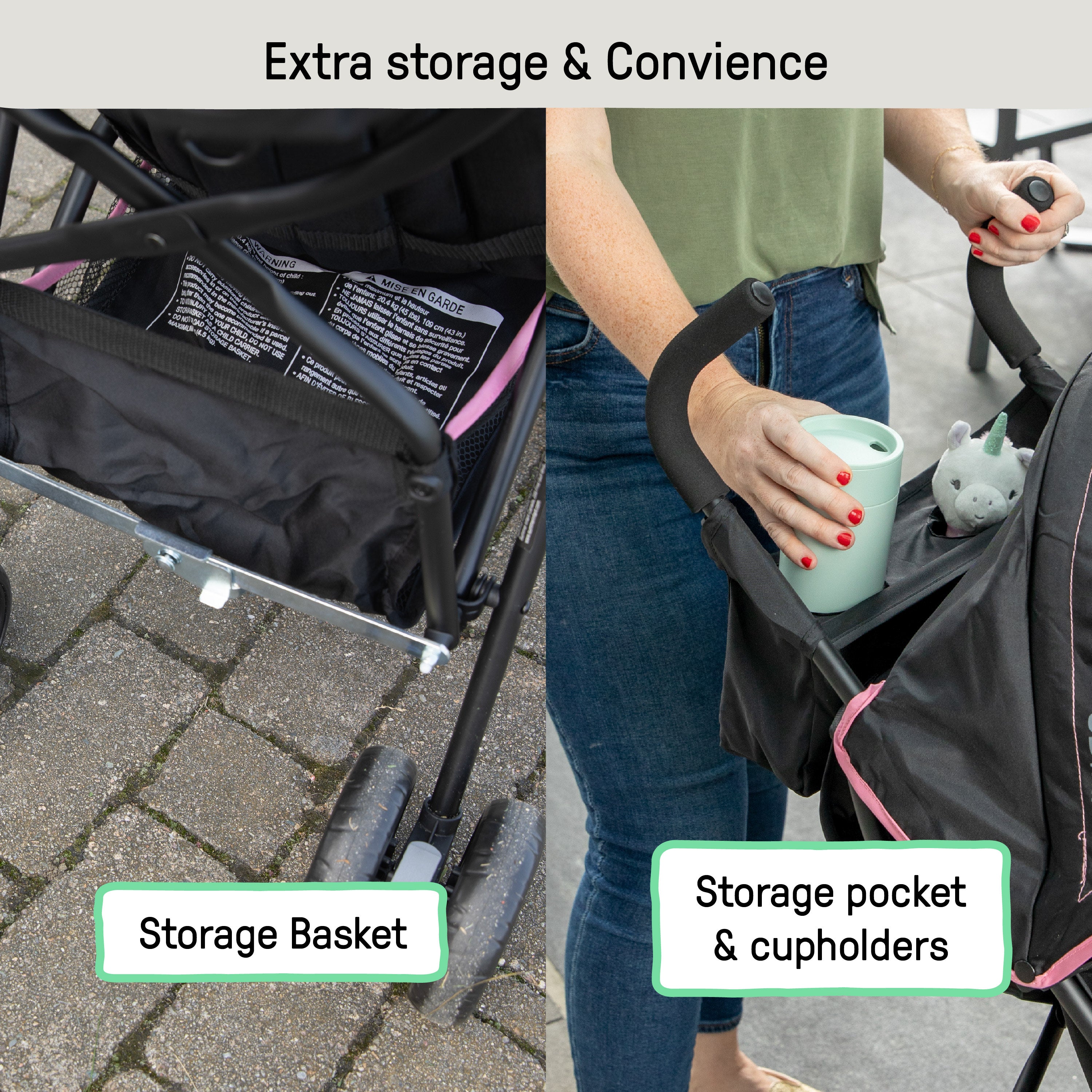• Includes 2 cup holders, rear storage pocket, cushioned handlebars, and a large, easy-access storage basket so you won't have to leave anything at home
