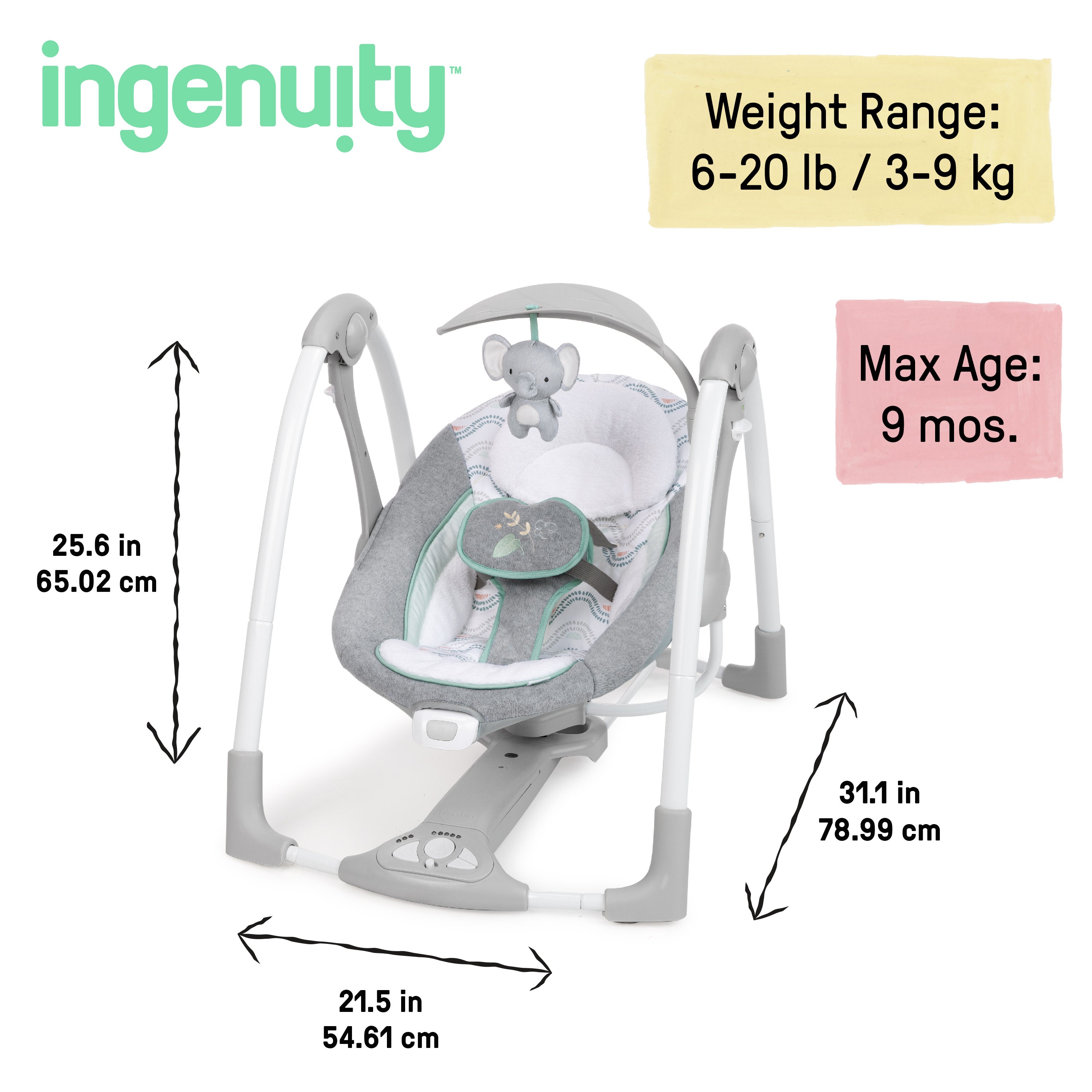 Your newborn can swing or sit in comfort with the Swell Portable Swing from Ingenuity. When your infant wants to sway, the automatic swing setting will calm and comfort. Quickly and easily convert it into a stationary seat with our secure EasyLock system. In either mode, baby can enjoy soothing vibrations. This travel friendly baby swing features a foldable design so it can lay flat for easy storage and portability. Soothe your little one with 5 swing settings, 12 melodies and 4 nature sounds or keep him entertained with plush elephant toy included. When you need to scoop up your baby, our innovative leaf-shaped toy bar easily pivots out of the way. Power the swing motion and music with the included USB cord, while 1 C battery powers the vibration unit. When things get messy, remove the machine washable seat pad and headrest for easy cleaning. With a gender neutral design and plush fabrics, this swing makes a great baby shower gift idea for boy or girl. This compact and take along swing-to-seat is ready for the ride wherever you need to go. Use from age 0 to 9 months or up to 20 lbs.