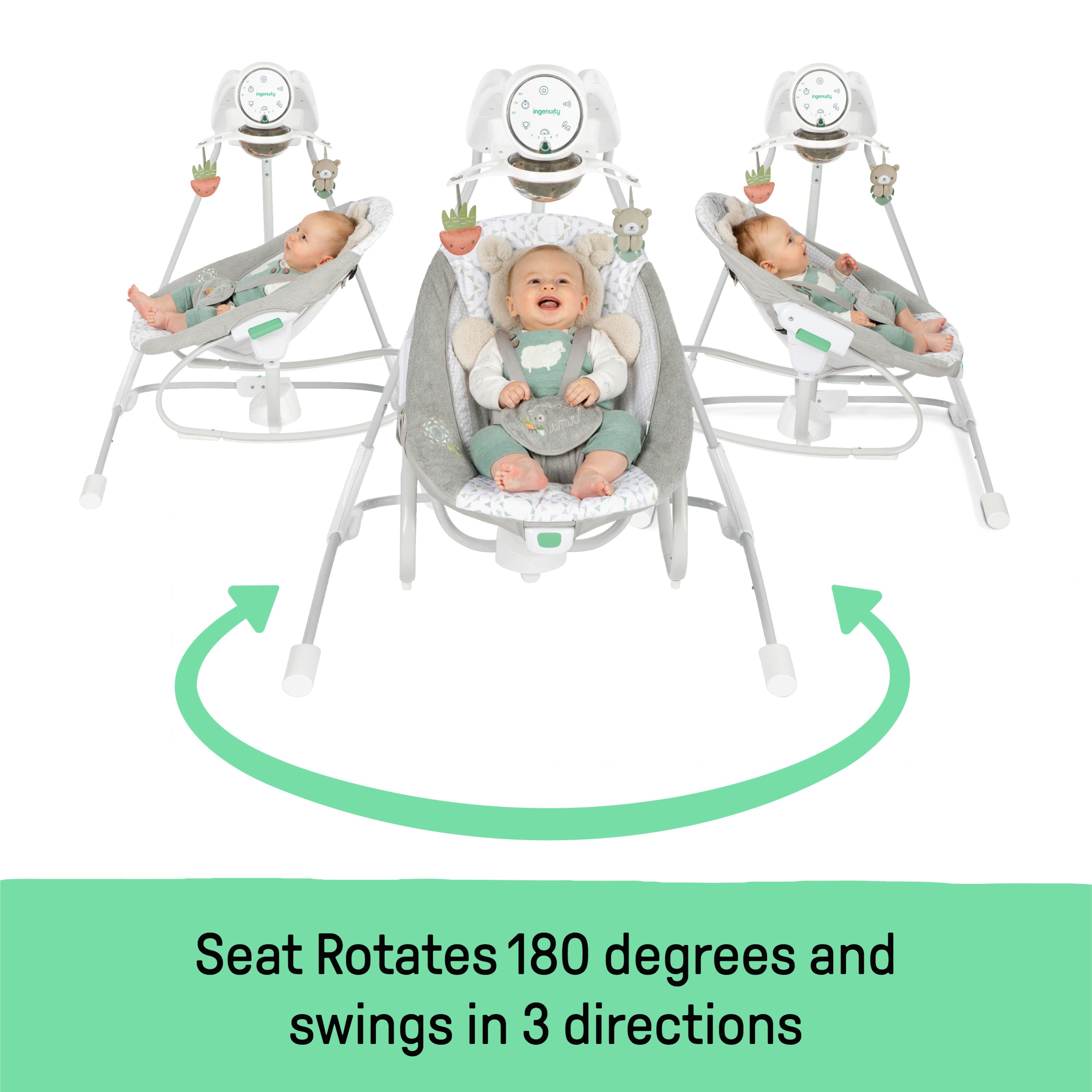 - The Ingenuity InLighten Soothing Swing & Rocker - with Nate the bear character bolster, combines two parenting must-haves in one; Rotates 180 degrees and swings in 3 directions with soothing vibrations help calm baby