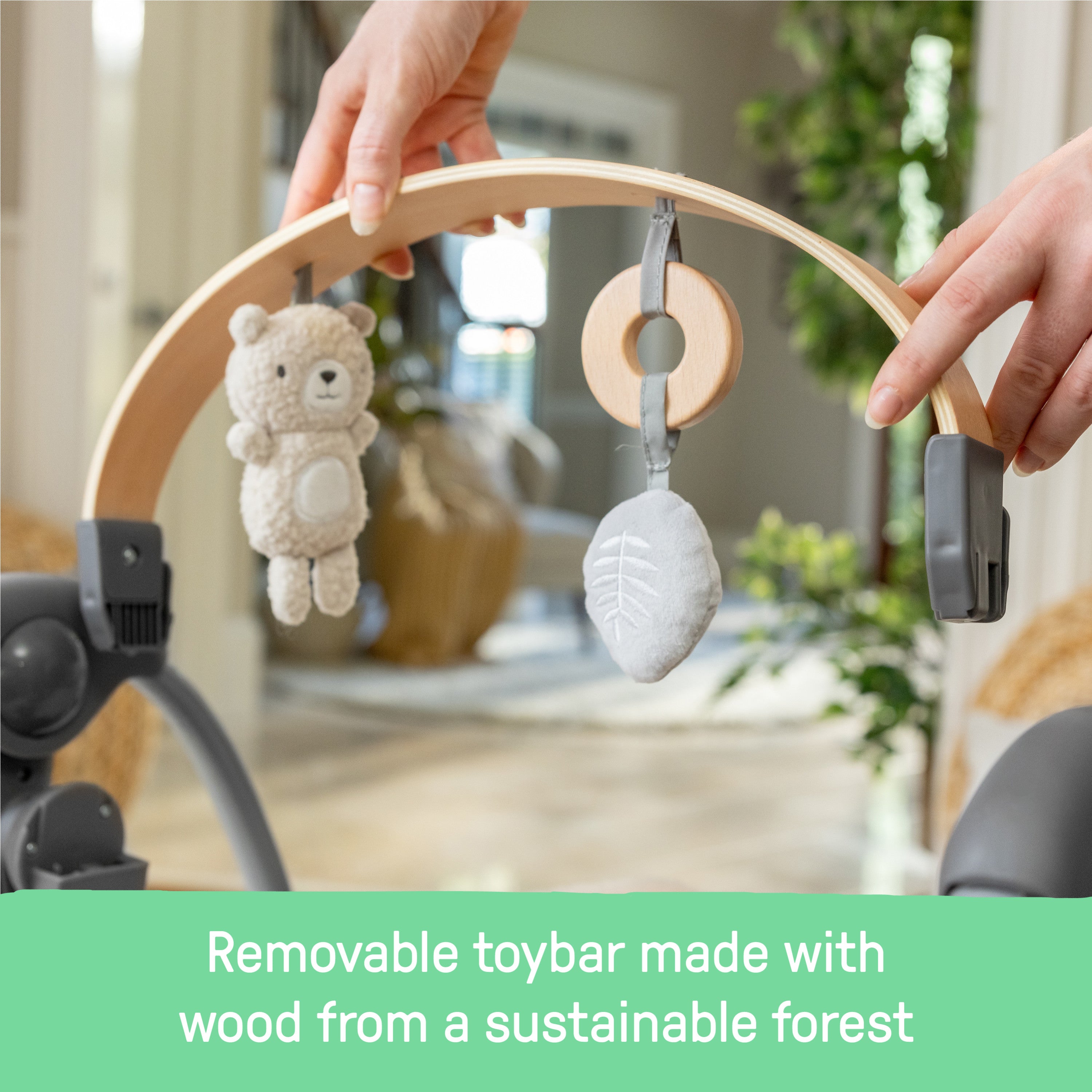 - A detachable toy bar, made with wood from a sustainable forest, includes a removable soft plush Nate the Bear character toy and wooden ring toy
