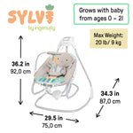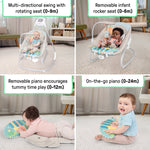 The 4-in-1 playtime set that takes baby from 0 months to 2 years! The Piano Playtime Baby Swing & Rocker gives you and your little one plenty of options to grow and play. From a swing to a rocker to tummy time to piano fun, get thousands of hours of joy and learning from a single item. As a Swing, 180° seat rotation gives baby 3 swinging directions and 6 swing speeds with auto timer options for 15, 20, or 30 minutes. A 5 point harness keeps baby secure as you get things done around the house, all while keeping baby happy and within sight. As a Rocker, 2 adjustable reclining positions help you keep baby comfortable as you rock them gently with your foot or hand. We all know tummy time can be tricky. Let baby strengthen their muscles on a comfortable musical activity mat that keeps them engaged and encourages more time on their tummy. As baby outgrows the rocker and swing, they’ll still love the removable playtime piano, that can go with them from room to room. Baby will love its upbeat melodies, nature sounds, and soothing vibrations. All of these features come together in one convenient set, which is easy for mom or dad to move around the house with a lightweight frame and easy to grab handles. Give your little one hours of playtime fun and learning with this unique 4-in-1 swing.