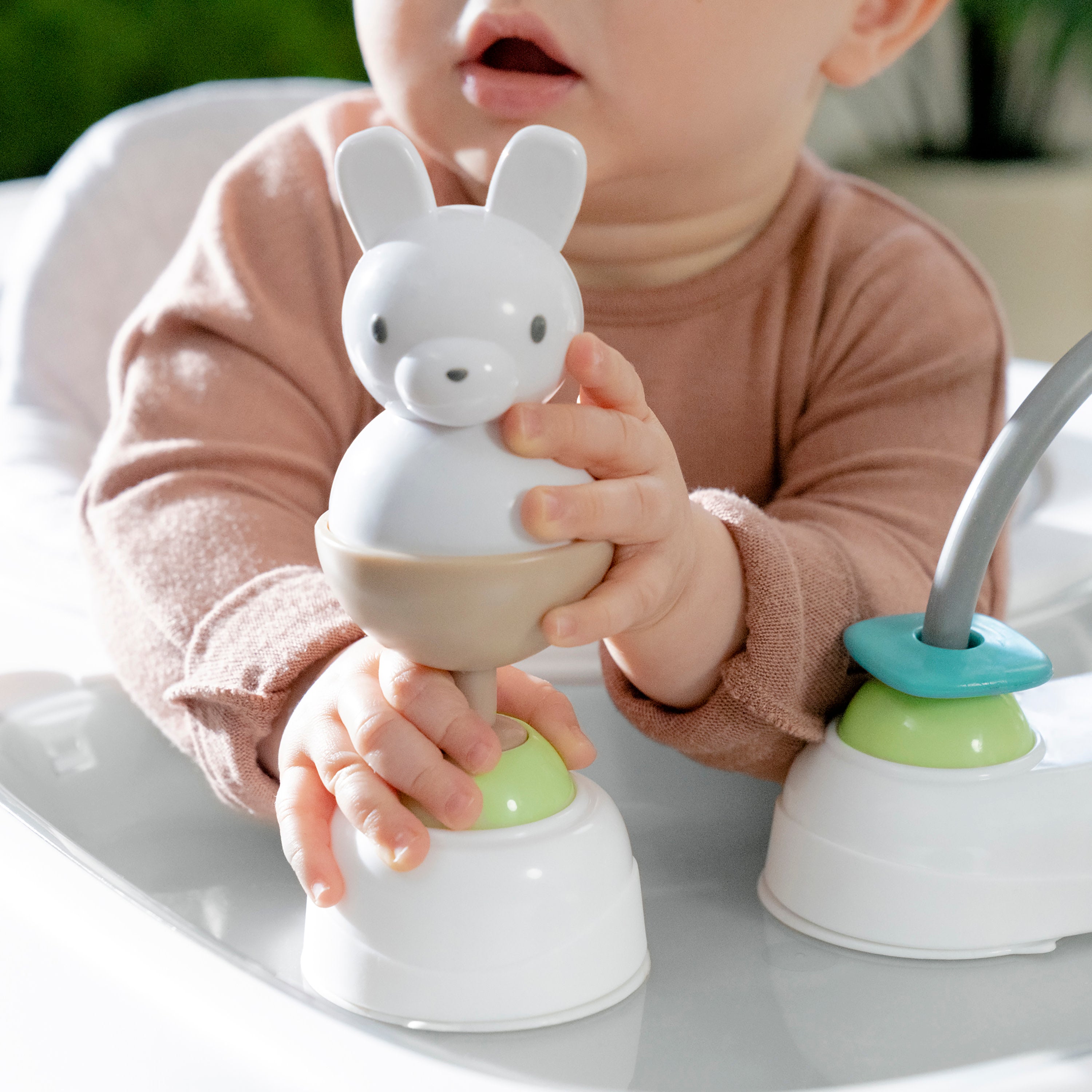 • 3 removable, nature-inspired toys with suction cups help keep baby engaged & entertained