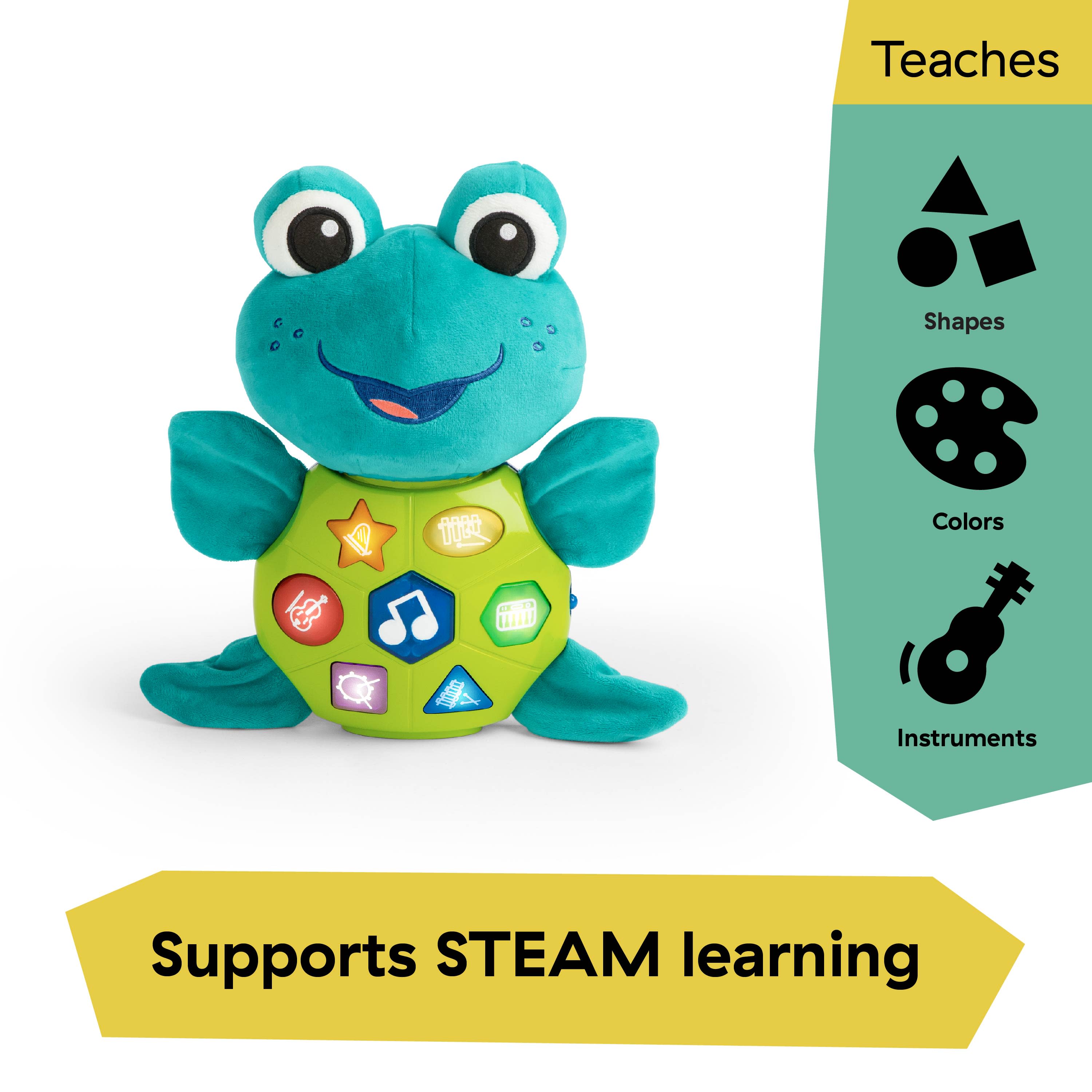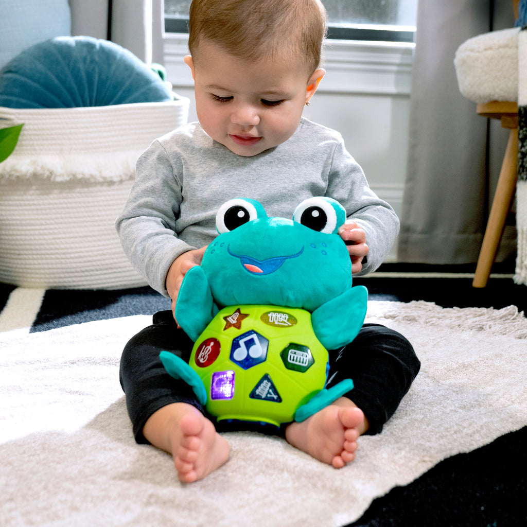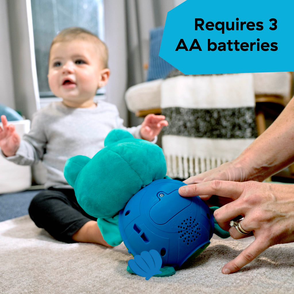 The Baby Einstein Ocean Explorers Neptune’s Cuddly Composer Musical Discovery Toy is a soft plush that comforts and entertains baby as they explore colors, shapes, and music. Featuring 50+ melodies and sounds, 3 languages, lights, and 3 modes of play, baby will love to explore music, words, and textures in this multi-sensory toy. 3 modes of play: A press of Neptune’s shell in Composer Mode lets baby play 8 classical melodies and explore 6 instrument sounds. Learning Mode includes colors, instruments, and shapes in 3 languages -- English, French, and Spanish. Ocean Sounds Mode lets baby explore and layer ocean and water sounds. Every press of Neptune’s shell stimulates baby’s cause and effect skills and helps baby explore instrument sounds, shapes, and more. 6 instrument sounds in all – marimba, percussion, electric piano, xylophone, harp, and bass. Features Neptune the Turtle from Baby Einstein Ocean Explorers. For ages 6 months and up. Requires 3 AA batteries. Plush wipes clean.