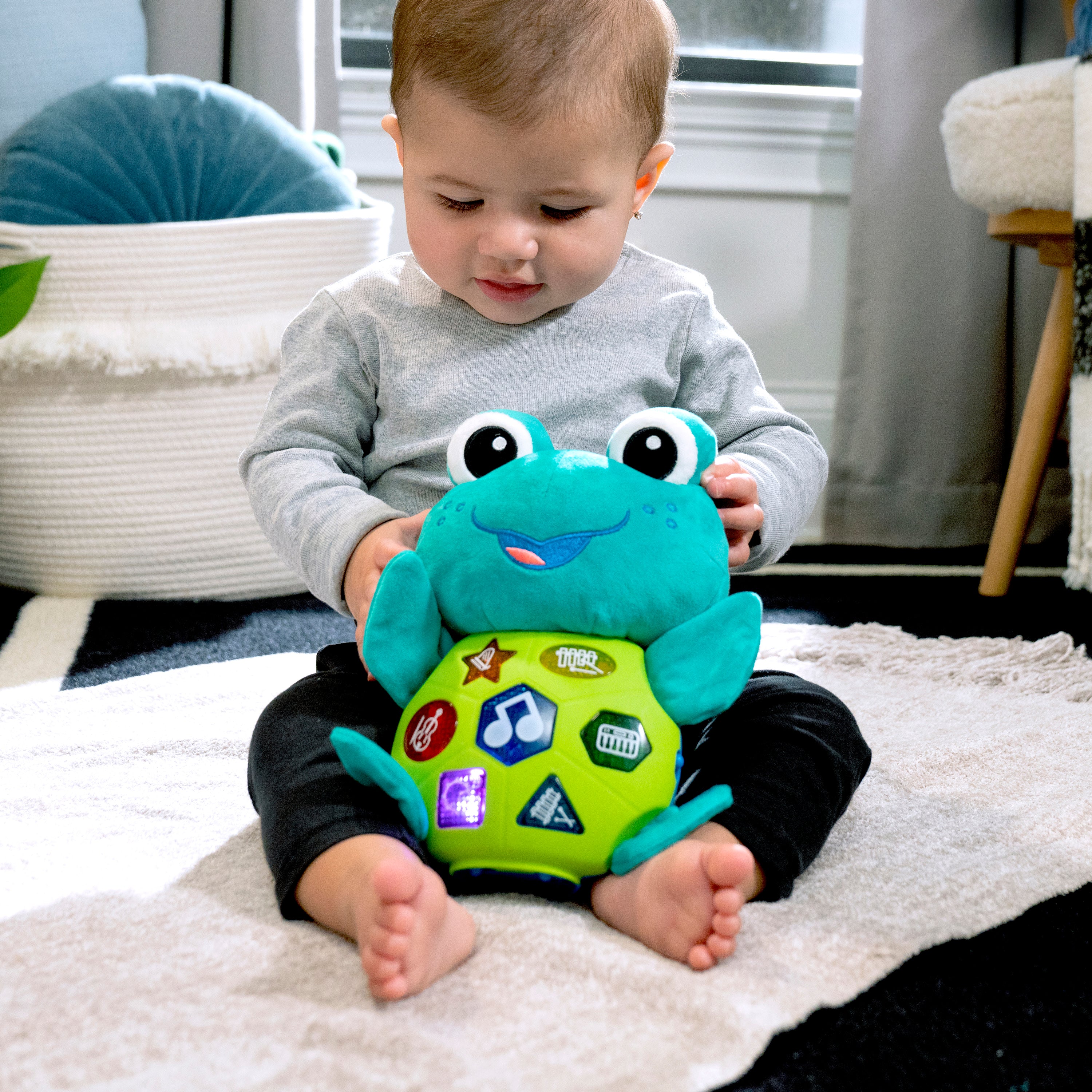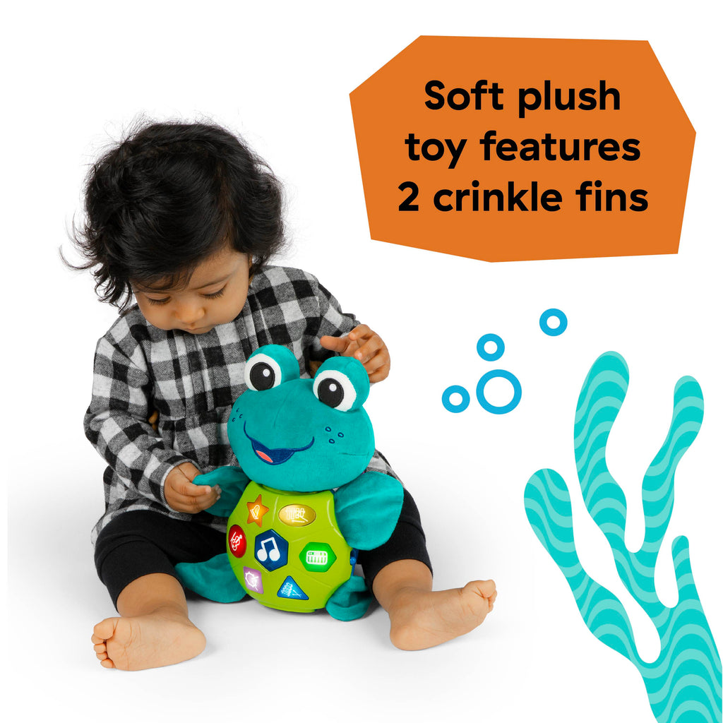 - Pressing Neptune’s shell triggers lights, sounds, and music, and reinforces baby’s cause and effect skills. 2 top flippers feature crinkle sounds.