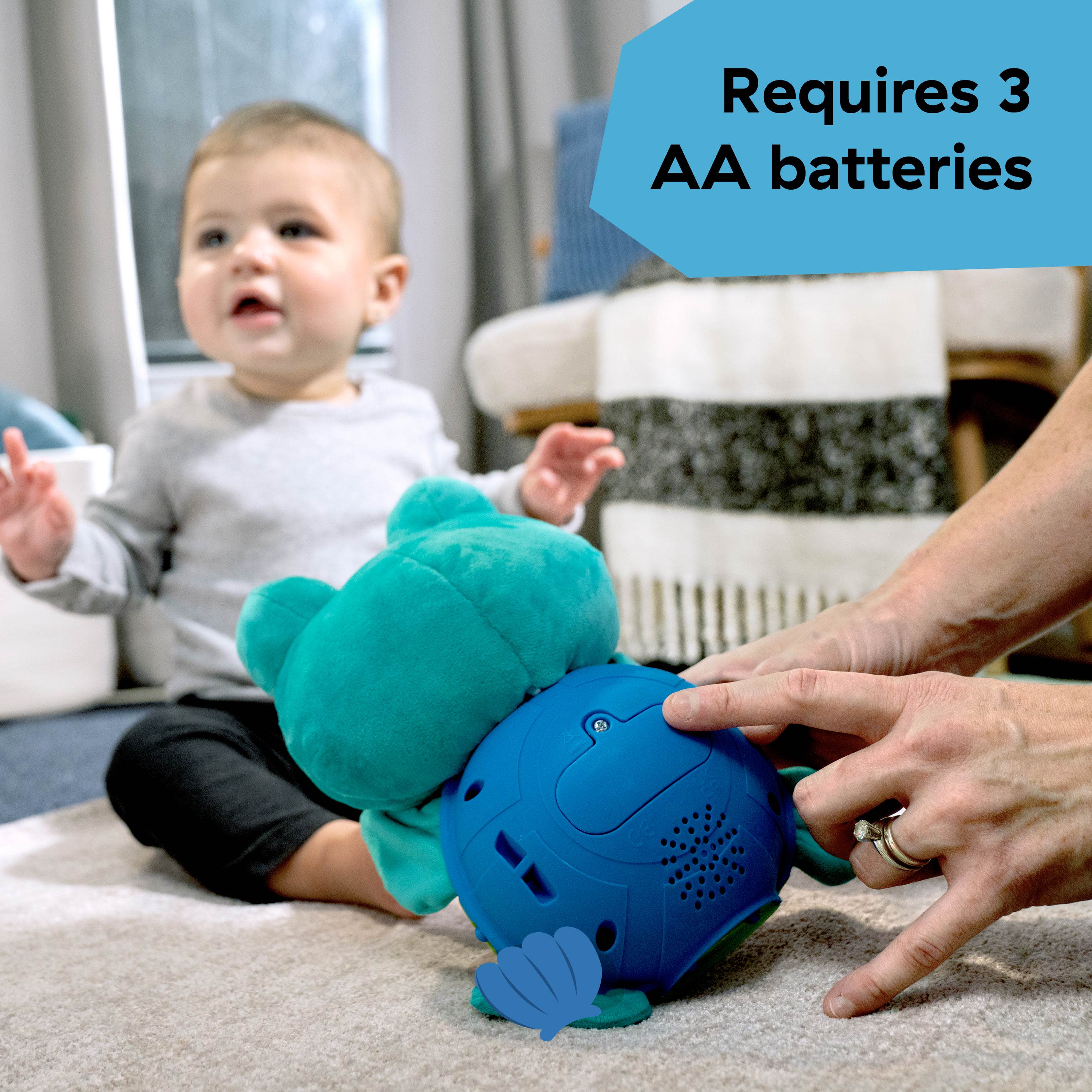- Soft, comforting plush features Neptune from Baby Einstein Ocean Explorers show, and engages baby’s senses with lights, 50+ melodies and sounds, and crinkle flippers.