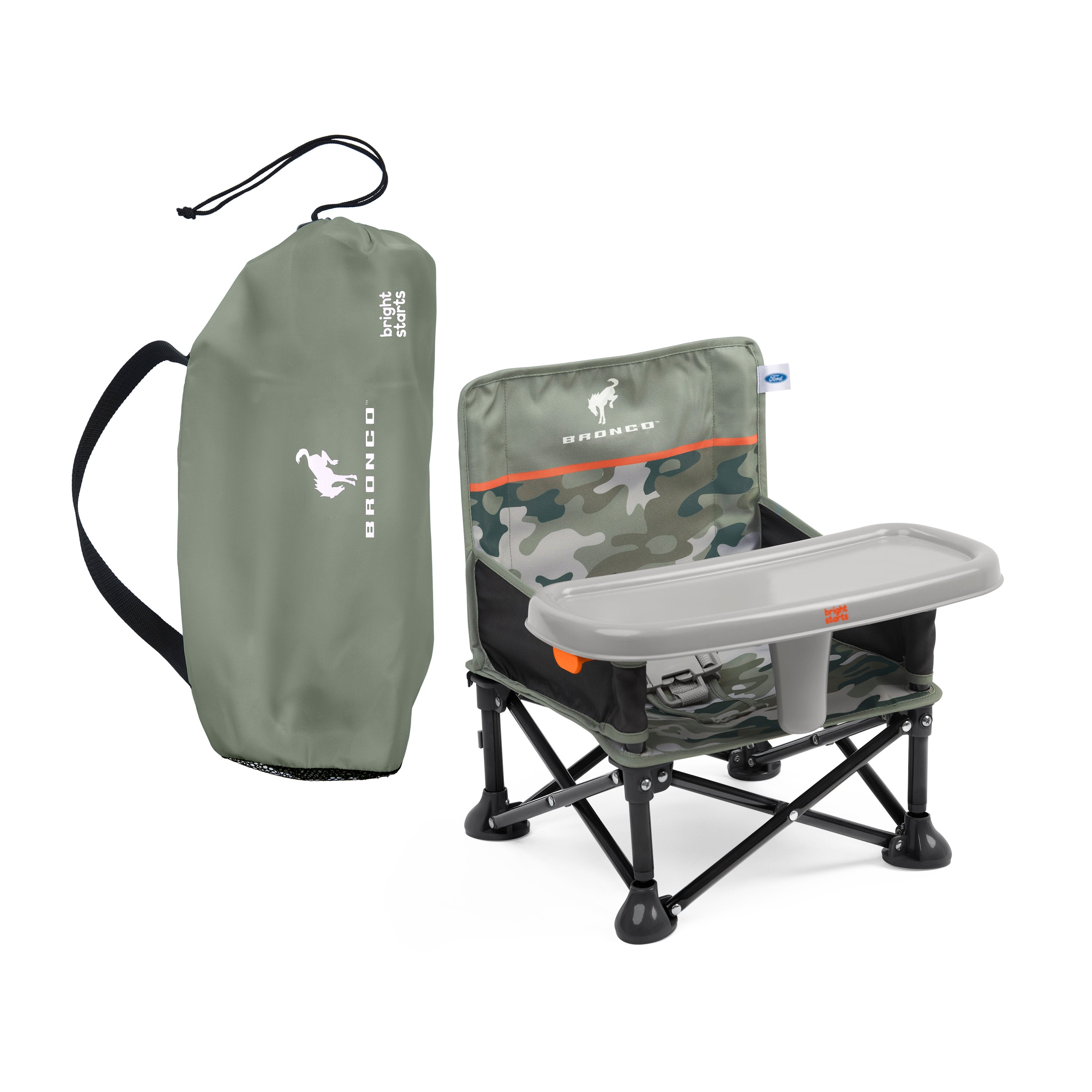 Shift into rugged adventure mode in the Ford Bronco Pop ‘N Sit portable booster seat from Bright Starts, with over 2 million sold! From inside to out, baby to toddler, and mealtime to playtime, this multi-purpose travel booster in Desert Gray camo print offers your little one a secure place to sit - no matter what the day has in store. Features 3 modes of use: floor seat, feeding seat with removable tray, and toddler booster. For babies, attach the seat to an adult chair using the included straps and tray to create a portable feeding seat. For toddlers, use the seat as a booster that can pull up to the table by removing the tray. In floor mode, you can use the Ford Bronco Pop ‘N Sit whenever you need an extra baby seat - picnics, sporting events, or right at home! The rear storage pocket holds your daily essentials. Folds compactly when not in use and includes a carrying bag with shoulder strap. Features a dishwasher safe tray and machine washable seat pad. Dimensions: 14.57" (H) × 15.35" (W) × 15.35" (L) when folded. Made for 6 months to 3 years old or up to 37 lbs.