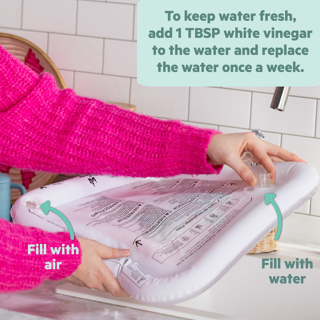 - Easy to use - just add water and 1 tbsp of vinegar into the mat before playtime & squeeze to release & drain; easy to clean with damp cloth & mild soap; made with high quality materials to avoid leaks