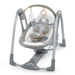 - The Ingenuity Swing 'n Go Portable Swing is a unisex foldable mini swing designed for easy transport; Boutique Collection features premium fabrics and soft, fleecy shoulder strap cushions