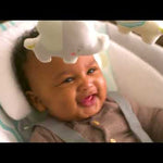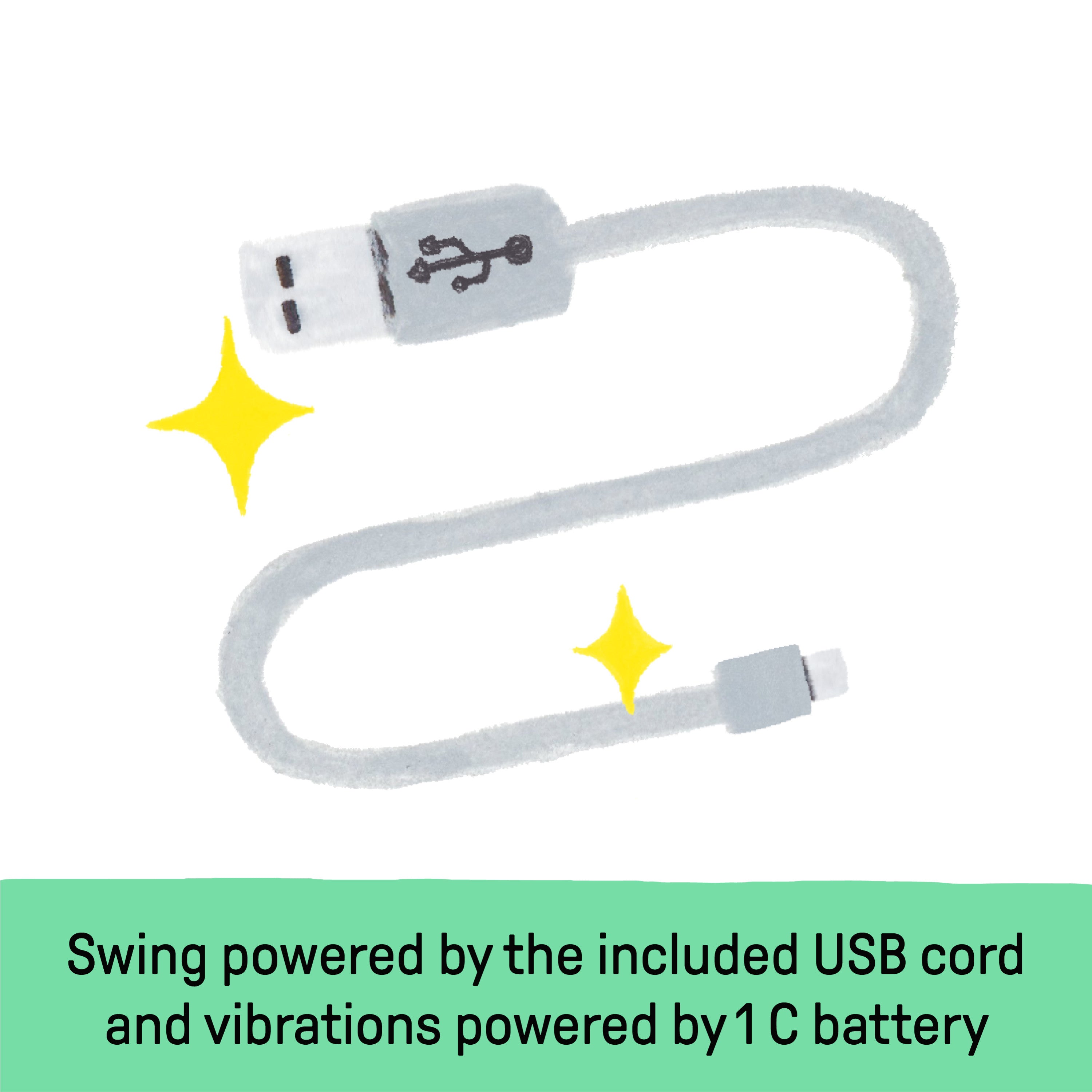 - Features soothing vibrations & an overhead mobile with 2 plush toys; Swing motion and music powered by the included USB cord and vibrations powered by 1 C battery (not included)