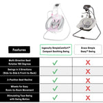 - The Ingenuity SimpleComfort Compact Soothing Swing rotates 180 degrees & swings 3 directions; Swing your baby in comfort with 6 speeds, 8 melodies, 3 nature sounds, & white noise