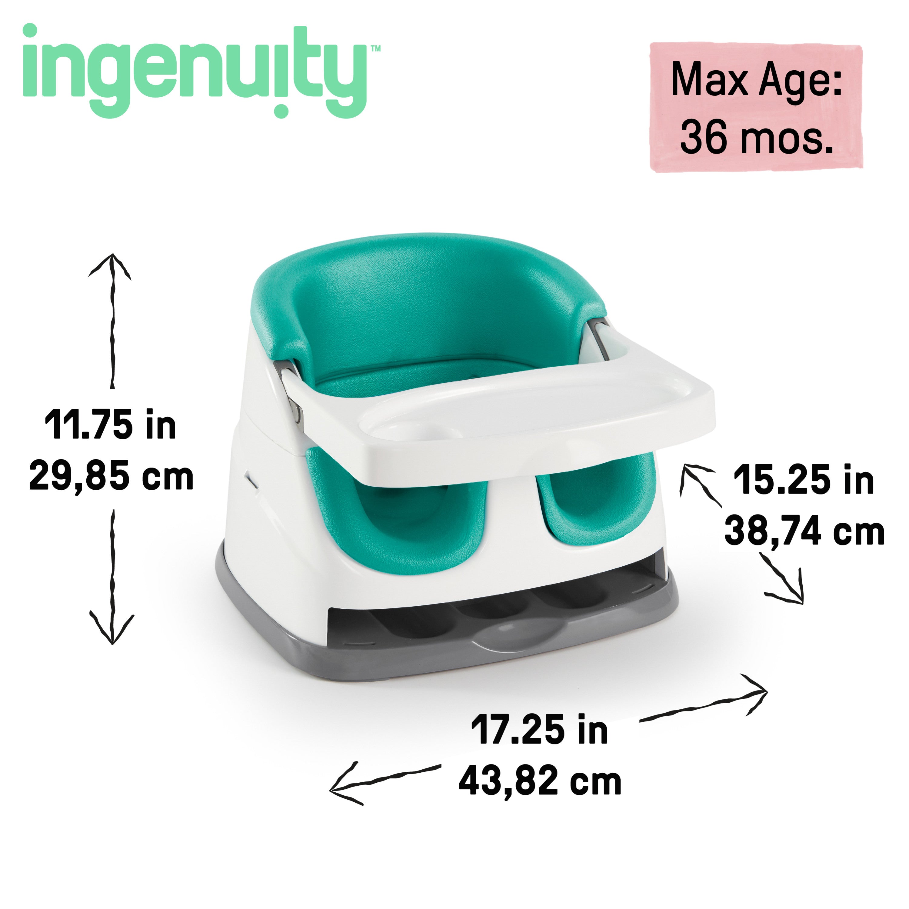 - The booster that grows with your family; convert from baby booster to toddler seat by removing the foam insert; supports up to 33 lbs; assembled dimensions 17.25x15.25x11.75; tray holds your favorite plates up to 11 x 5 in.