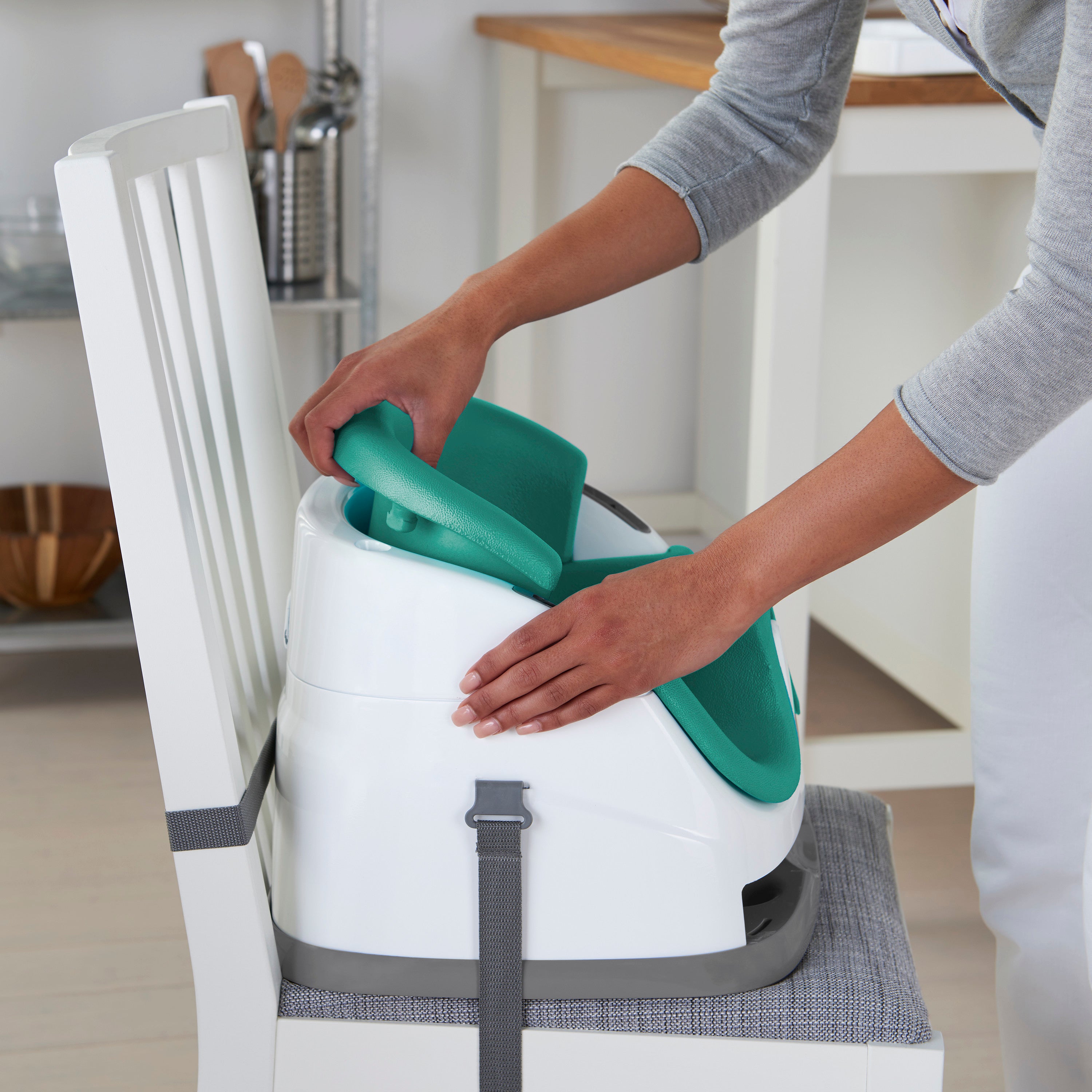 - Safe infant seat with harness for babies sitting up; adjustable straps attach the booster to most dining chairs; bottom straps are 22 in. with placement 5 in. up each side of the base; back strap is 36 in.