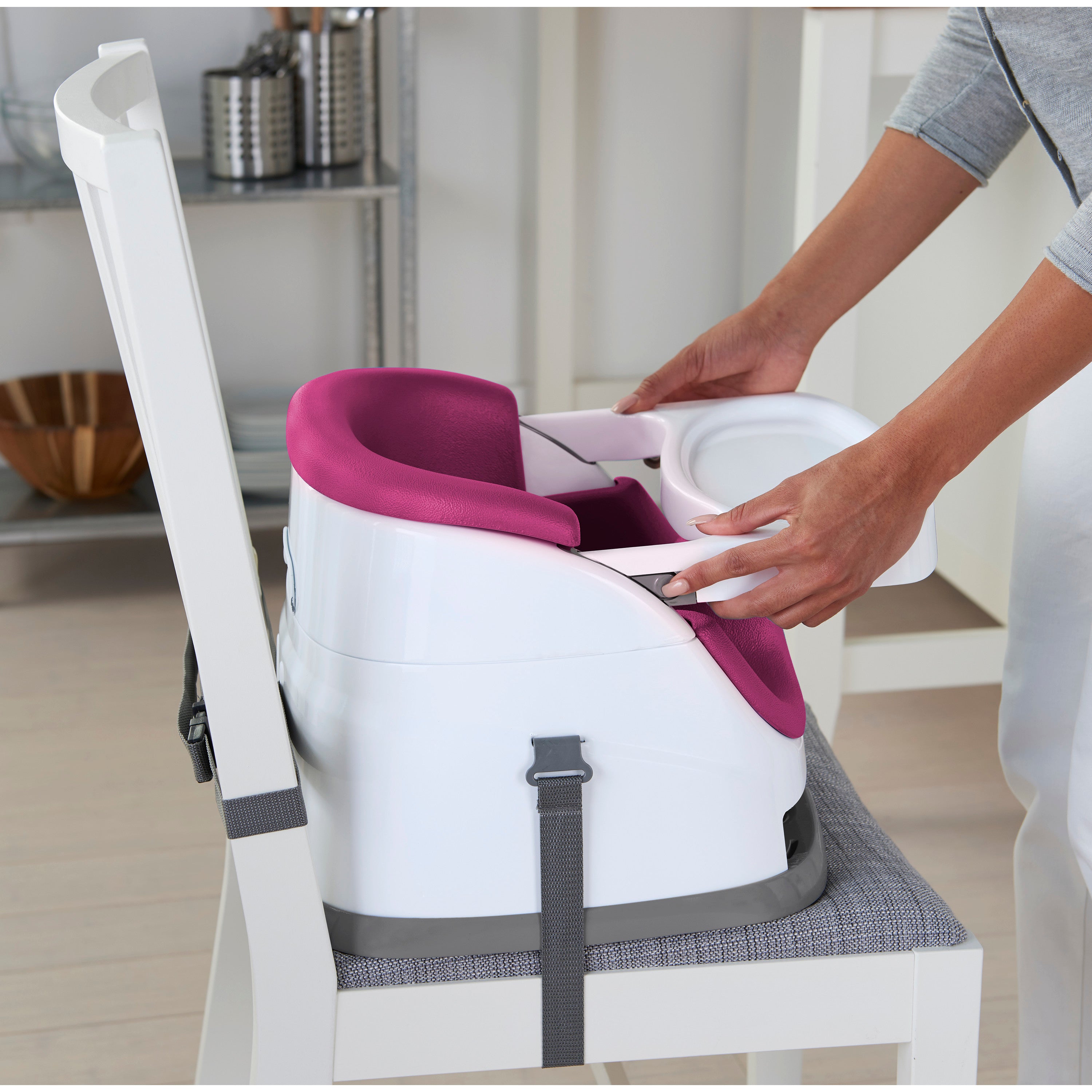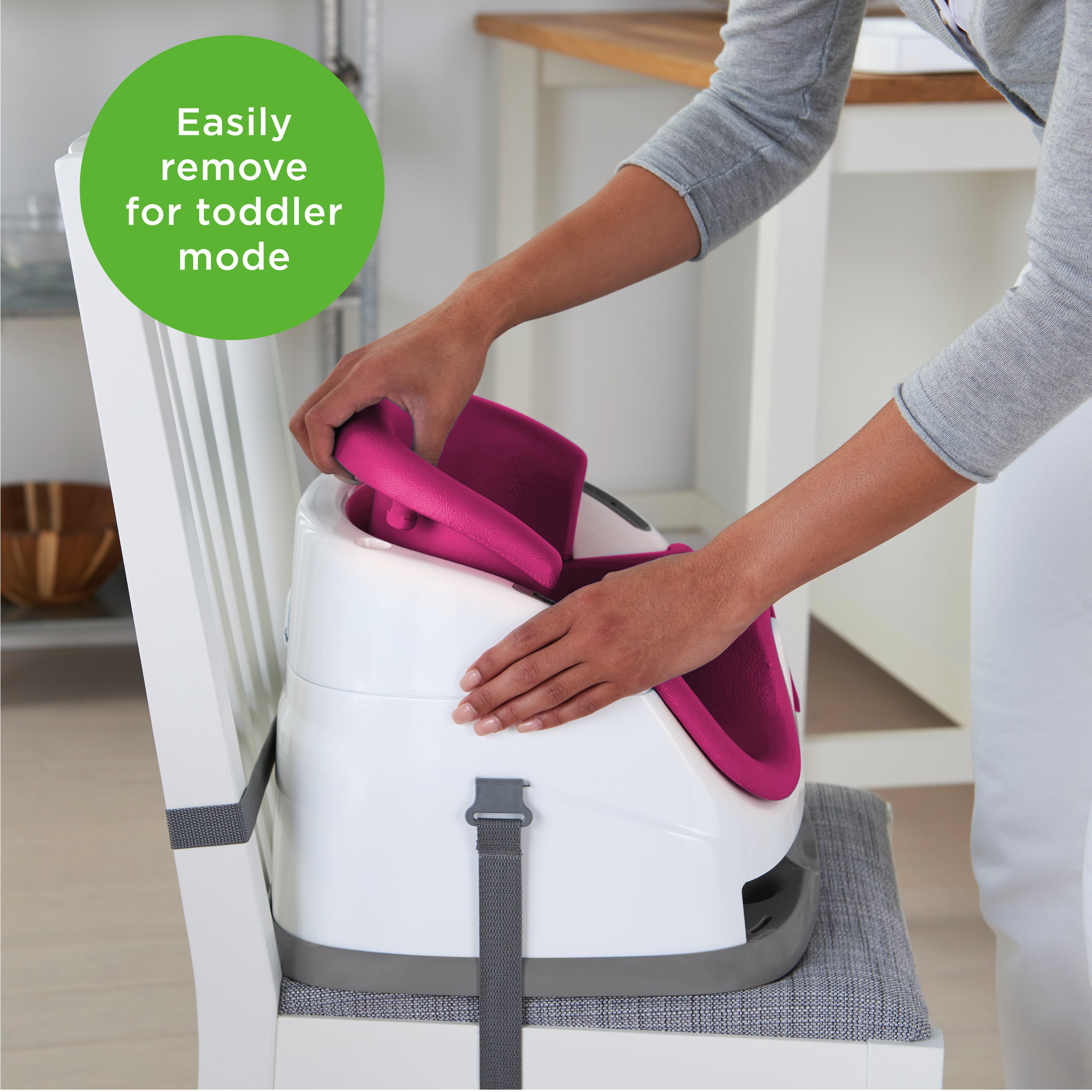 Meals are an important part of family time. Enjoy more laughter and conversation – including baby talk – by giving your little one a seat at the table. The Ingenuity Baby Base 2-in-1 Booster Seat easily attaches to dining chairs so your baby can sit up higher and see more during family dinners. This portable baby feeding seat works just as well sitting with you at the table or as a floor seat during playtime. The removable tray gives your baby her own perfectly sized table, so snacks or toys are easily within reach. When not in use, the tray conveniently tucks away right underneath the booster seat itself. As your baby grows, you can remove the foam seat insert and convert the baby booster into a toddler seat. For all those meals in between, you can count on the wipeable seat and dishwasher-safe tray to leave you more time for family catch-up and less for kitchen clean-up.