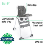 The Ingenuity SmartClean Trio Elite 3-in-1 High Chair in Slate easily transforms 3 ways from a traditional highchair to a chair top booster to a toddler seat. Easy to clean and designed to match modern home decor, this convertible highchair features thoughtful details that make mealtimes easier for babies and parents alike. The EasyClean tray is dishwasher safe, attaches and detaches easily, and can hold plates up to 19 inches wide. Choose the right angle for baby’s comfort with the reclining seat, which adjusts with the push of a button. An adjustable 5-point harness keeps baby secure and features 3 shoulder heights to grow with baby. Babies and toddlers will love the extra comfort of the cushy, EVA foam insert and parents will love that both the insert and frame wipe clean. As baby grows, transform the seat into a chair top booster by securing it to an adult dining chair with the included straps. Need space for a sibling too? Use the booster and toddler chair to seat both siblings simultaneously! Frame features wheels for easy moving or storage. Gender neutral gray color. For ages 6 months and up. Maximum weight for use: 50 pounds.