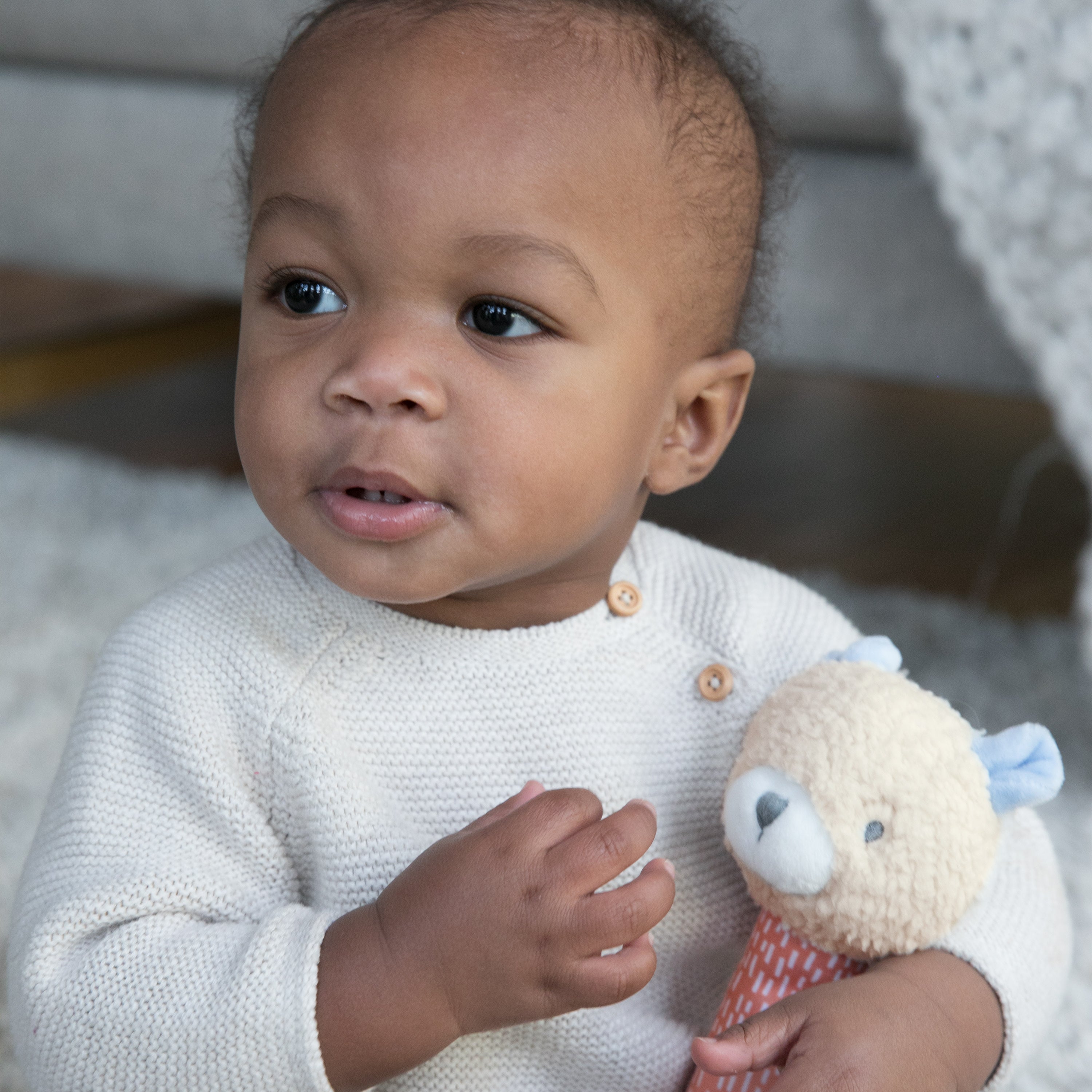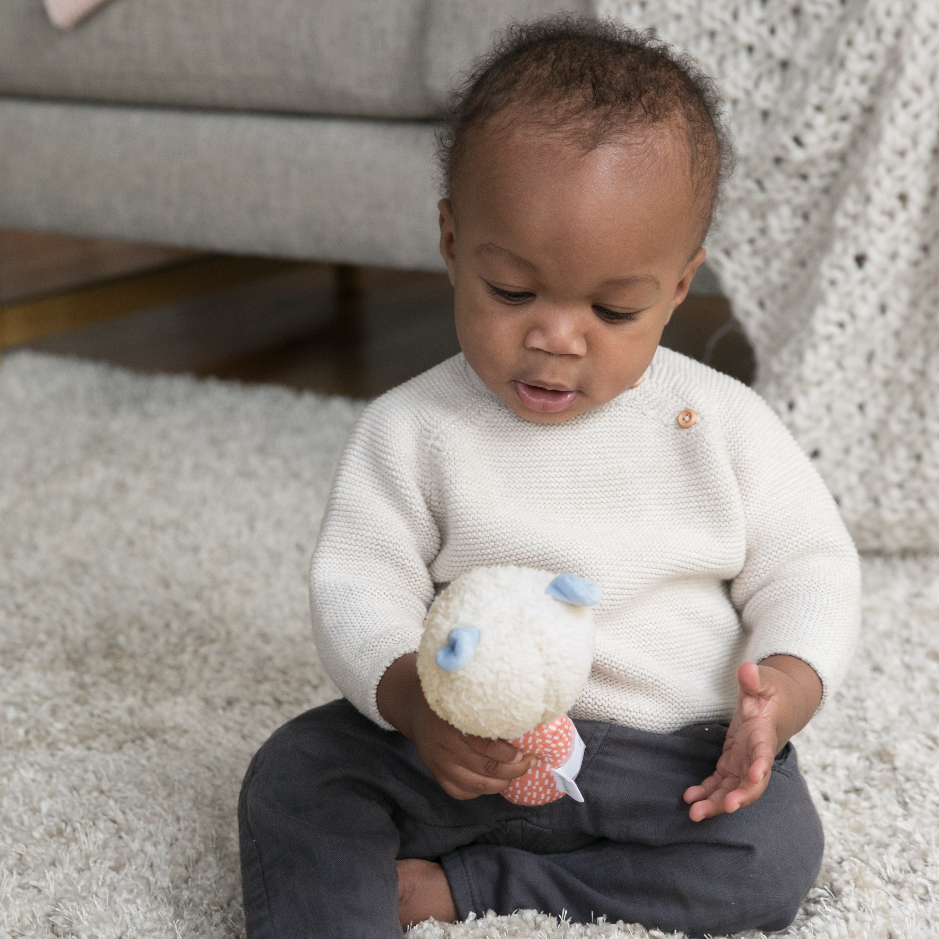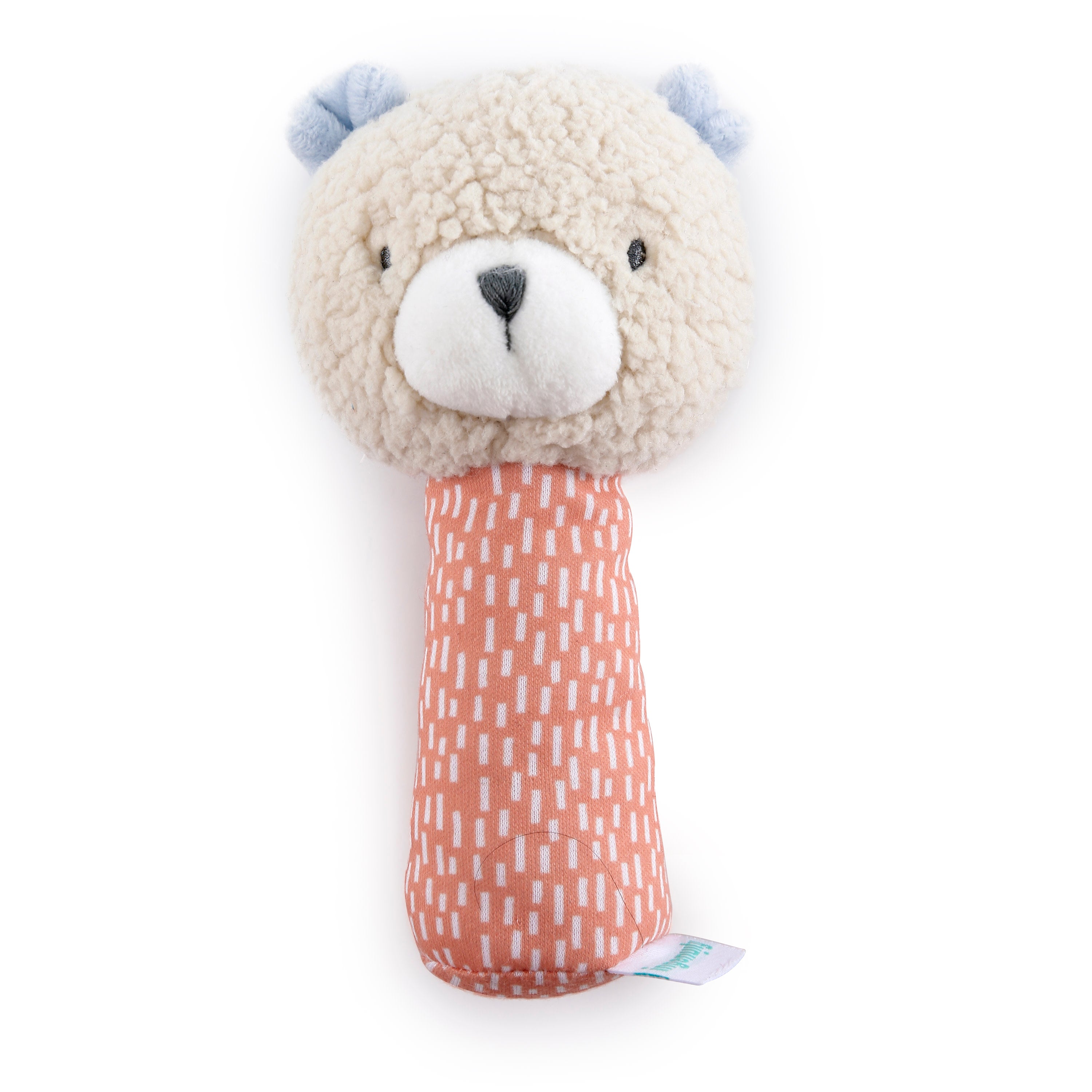 - Baby’s first stuffed animal has a classic rattle design