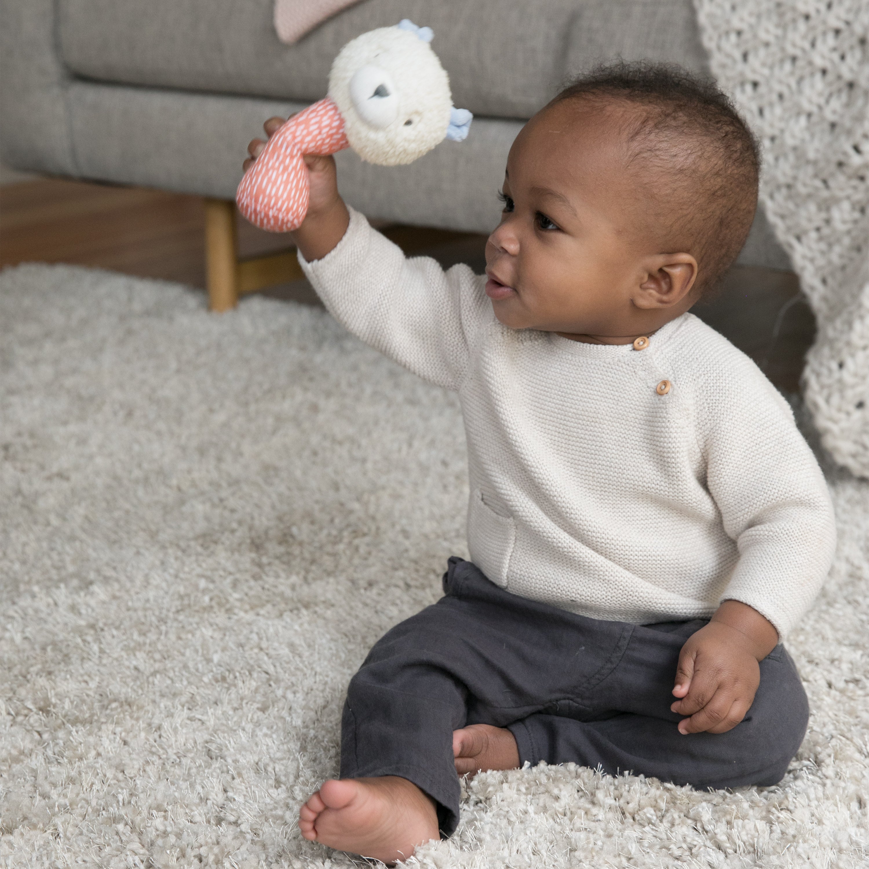Have your phone ready for a photo burst when your baby masters her new grasping skills. The Nate Handheld Rattle from Ingenuity is made with a stick rattle design that’s easy for infants to hold. With a combination of plush fabrics, this sweet plush rattle toy is fun for little fingers to explore and comfortable to shake and hold. Delicate beads create a classic rattle sound. Teddy bear Nate loves to hibernate, but he’ll rouse from his slumber to play with your little one!