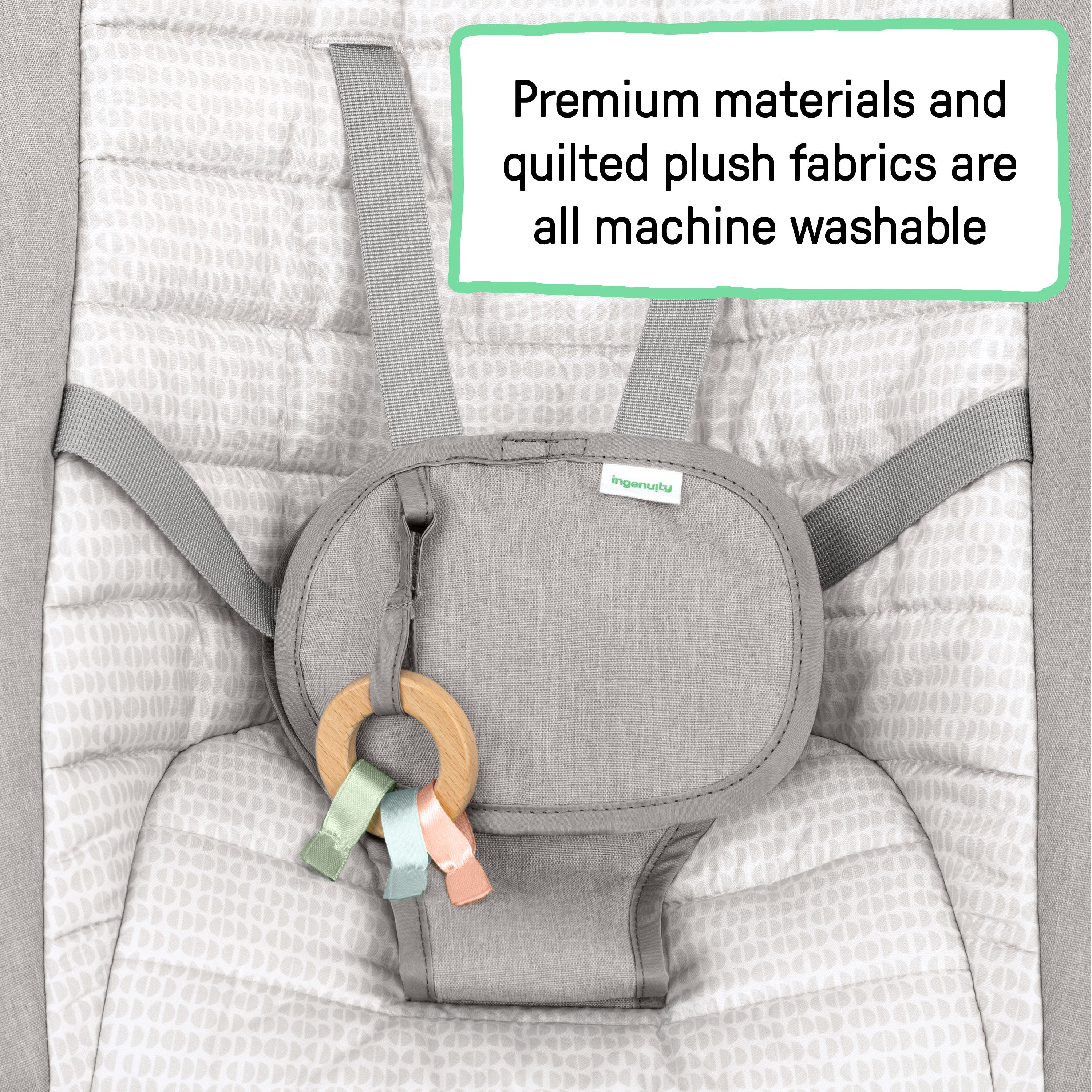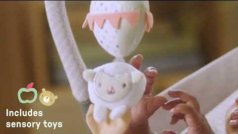 From bottles to belly-rubs to blankies, we've all had days where nothing seems to keep baby calm. Those are the moments that inspired us to create the Keep InMotion Automatic Rocking Seat, with plenty of options to soothe, calm, and entertain baby. This rocker features 2 speeds, so as baby explores each rhythm you can select the one that suits them best. With the switch of a button on the included remote control, you can give baby a seat that mimics your own gentle rocking motion, with 2 recline options for another level of comfort. Plus, the remote clips onto the attached loops to ensure it stays within parent's reach. In addition to rocking, this chair offers soothing vibrations and calming music with volume control. We use GentleTouch technology to make controls even easier for parents, grandparents, and babysitters to understand and navigate, so your little one can use their favorite features no matter who is looking after them. As baby rocks, or even when they don't, they can entertain themselves with the included plush hot air balloon toy or wood ring with sensory tags, all on the removable toy bar. This rocker fits perfectly in any modern house, with a chic frame, woven fabrics, and a quilted plush center. Plus, the machine-washable seat pad makes it easy to clean and the foldable design makes it convenient to store or take along with you with the included carry bag. For any household looking to keep baby calm, this rocker makes the perfect addition. From the #1 Manufacturer of Bouncers* (*Circana, US Dollar Sales, Jan-Dec ‘24).