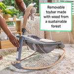 • A detachable toy bar, made with wood from a sustainable forest, includes a removable soft plush Nate the bear character toy and wooden ring toy