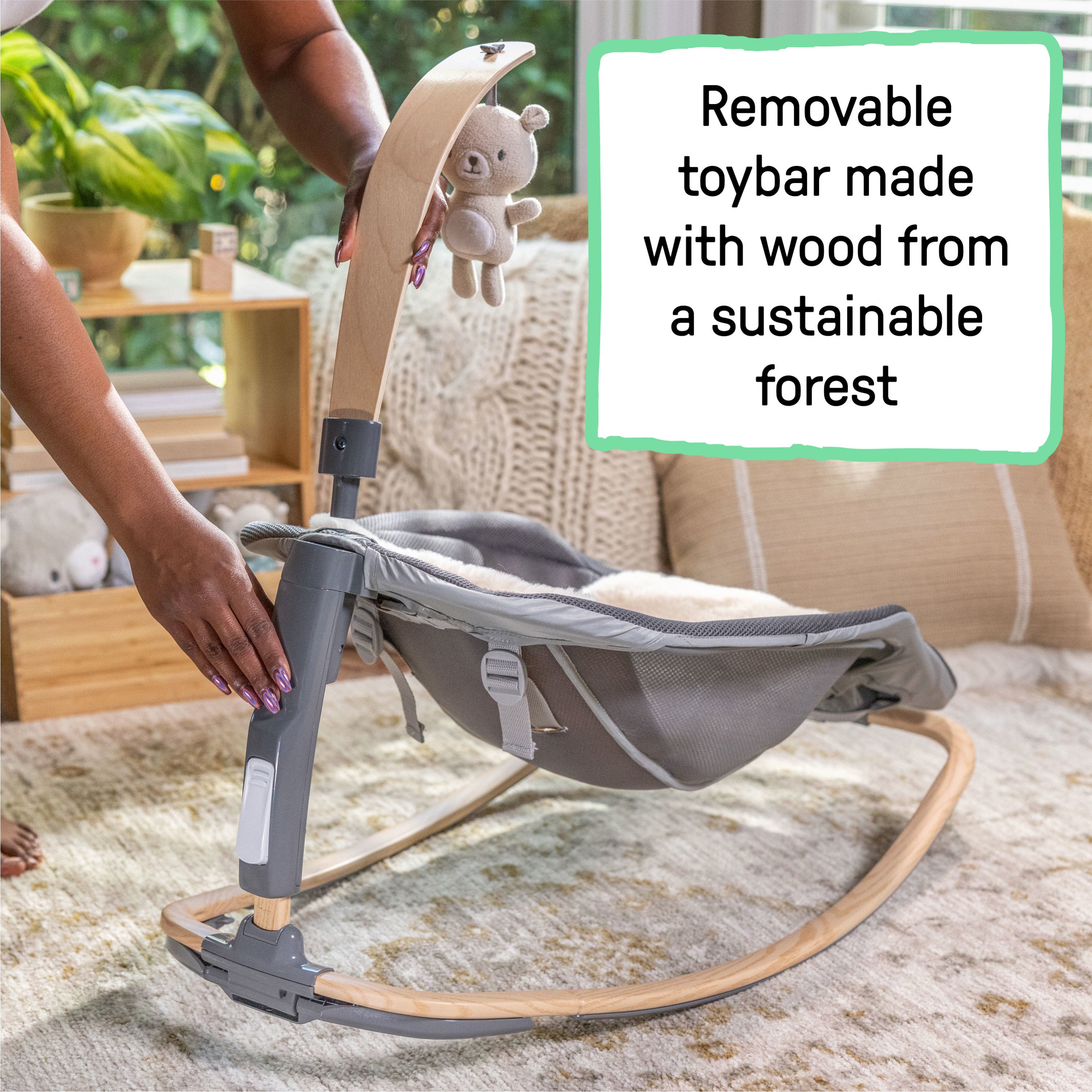 The right body temperature is essential to the happiness of your little one. Ingenuity's innovative Every Season™ Rocking Seat made with Air Flow technology is the simple, all-in-one solution to keeping baby consistently comfortable in any environment. The extra cozy lamsbwool is 100% natural and sourced from Australia. Plus, you'll get some extra use with this rocking seat as it converts to a stationary seat to grow from baby to toddler. A detachable toy bar, made with wood from a sustainable forest, includes a removable soft plush Nate the Bear character toy and wooden ring toy on a T-strap. The seat plays soft music and comforting sounds along with gentle vibration to soothe baby's fussy moments; sound and vibration require 3 C alkaline batteries (not included). Our innovative design helps you fold the rocker flat for easy storage and transport. The seat is made for babies ages 0-30 months or up to 40 pounds, whichever comes first. The Every Season Rocking Seat is the perfect baby shower gift for helping new parents keep baby comfortable and happy all year long.
