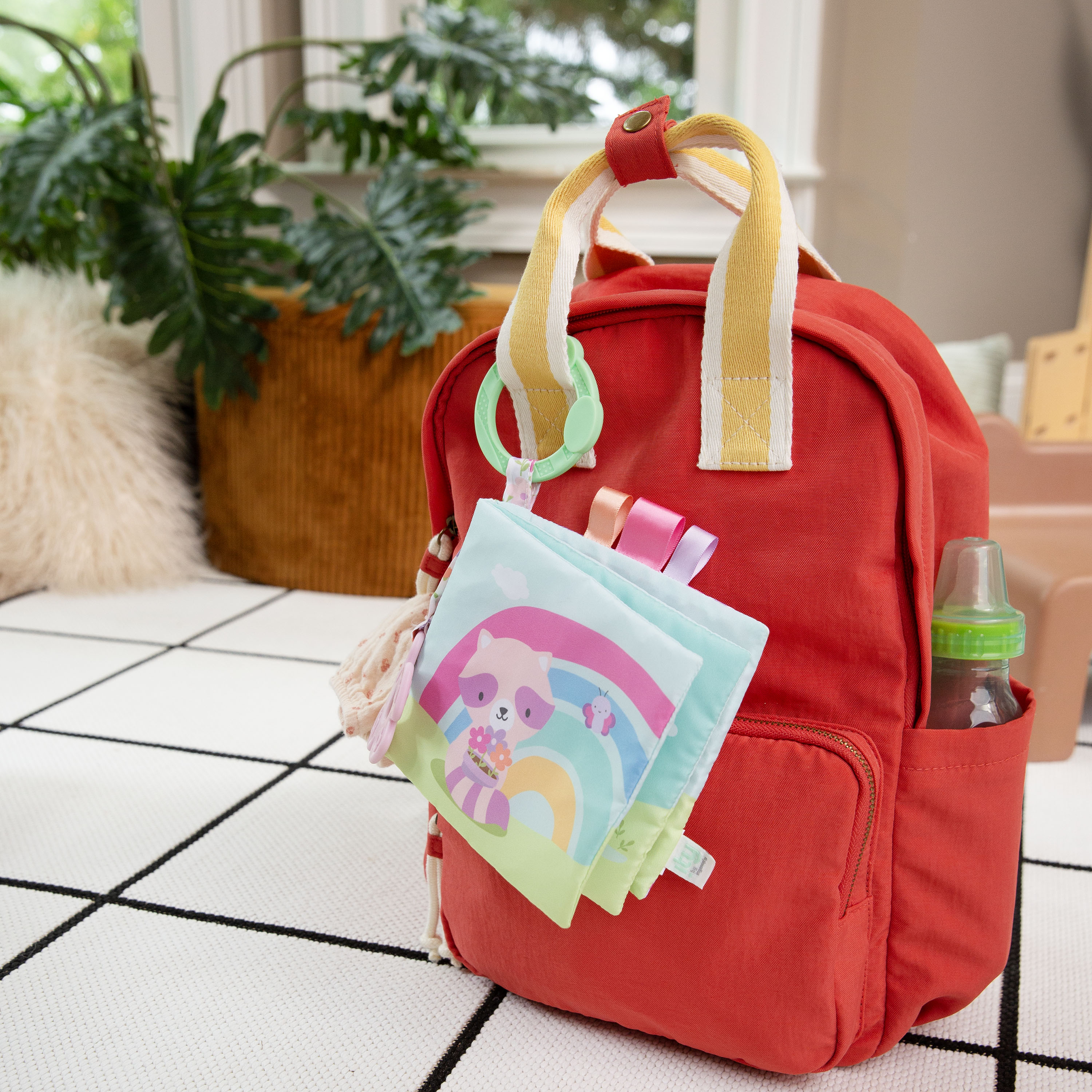 Raise baby to be a bookwork from birth with the ity by Ingenuity Soft Book - Deni! This 4-page language-neutral book is made of soft plush materials and features Deni the raccoon. The soft book features multiple textures to keep baby engaged, such as the crinkle (hidden inside) and 3 satin ribbon tags. The tags encourage self-soothing, while also helping to hone baby's fine motor skills. Need to keep baby entertained on the go? This soft book is the answer! The book's included C-link is great for attaching to stroller handles and diaper bags. A growing baby needs comfort 24/7. So, we've included a BPA-free flower-shaped toy to help soothe baby during fussy moments. Baby will love the Deni the raccoon's exploration of a colorful garden in the soft book! This gender-neutral soft book is an excellent nursery gift that will easily become a parent's go-to comforter for baby. Pair this book, perfect for age newborn and up, with other ity by Ingenuity goodies starring Deni.