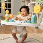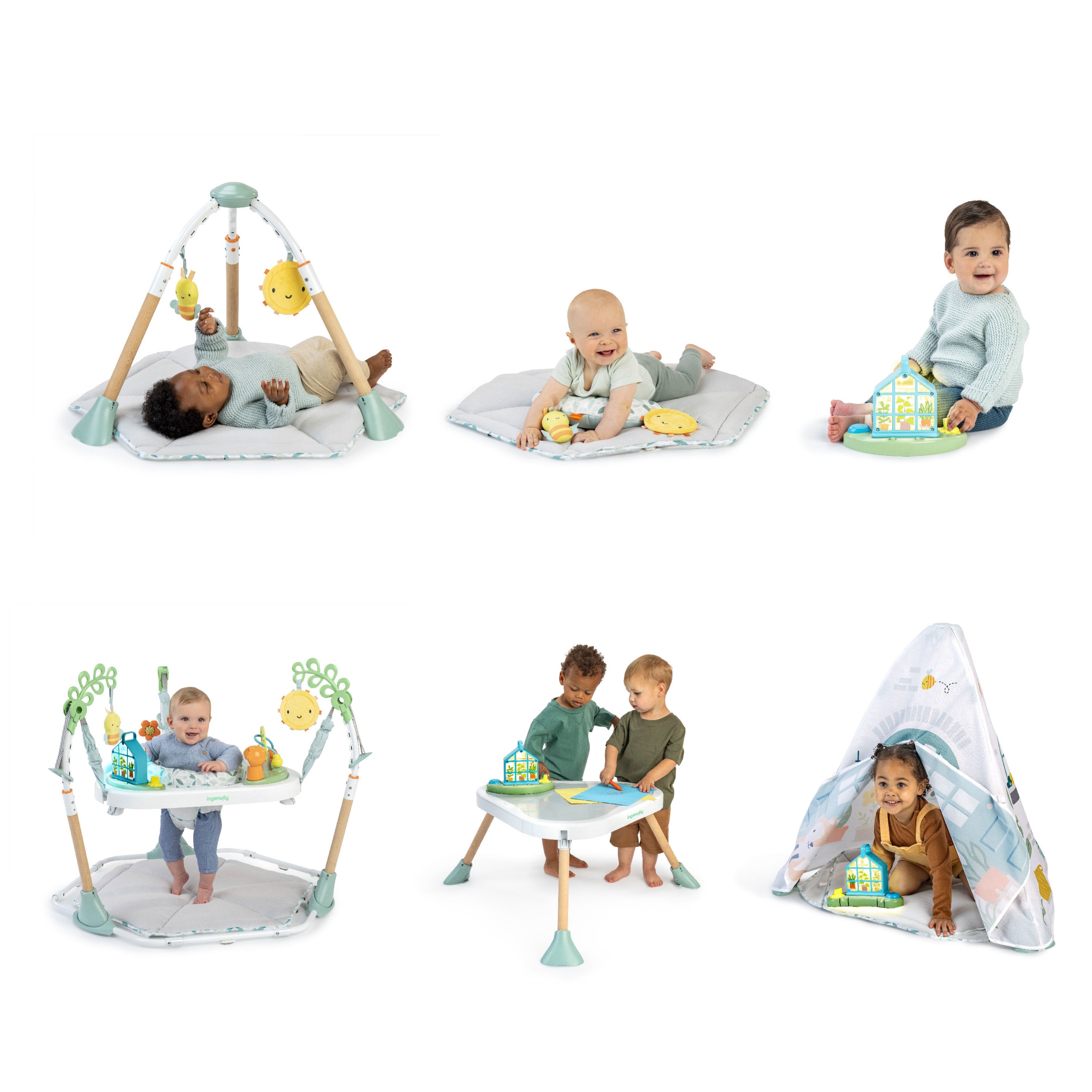 Ingenuity's first-ever all-in-one to enter the world of play is Tummy-to-Toes 6-in-1 Milestones Center! This multi-tasker has 6 different milestone-based activities for baby to big kid! Fun starts on day 1 with the the floor gym, which encourages reaching and grasping. The toy bar atop the foldable mat includes a detachable plush Bomby the bumblebee, a BPA-free cloud toy, and sun mirror. The soft, quilted, and padded mat gives baby a cozy place to play at home or on the go. The mat comes with a prop pillow for additional support and link loops to attach baby’s favorite toys. Inspire your little one's imagination while teaching cause and effect with the toy greenhouse! The greenhouse features lights, soft music, and nature sounds for baby to "water" and give "sunlight" to plants. The Milestones Center requires 3 AA batteries (not included) to operate. Baby will jump for joy in 360° play at 3 different toy stations. The activity jumper adjusts to 4 different heights. As your child grows, so does this center's features - which means standing is on the horizon. For standing moments, the jumper converts to a smooth surfaced activity table for open-ended play. The table's premium leg design provides a modern feel! The playhouse encourages independent play. Track baby’s progress with 12 monthly milestone cards and dry erase board. The Tummy-To-Toes 6-in-1 Milestones Center is the perfect all-in-one gender-neutral gift for children ages 0-48 months!