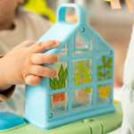 - Encourage imagination, plus cause and effect, with the toy greenhouse, which has lights, music, and nature sounds for baby to "water" and give "sunlight" to plants; 3 AA batteries required (not included)