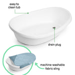 Keep your little one comfortable in the tub as they grow. Our unique 3-in-1 tub offers three modes to provide the support and space baby needs to sit properly from newborn to toddler. A unique wide sling design fits all the way across the tub to cradle baby for their first baths. The sling provides a sturdy yet comfortable space for baby to sit as you get them clean with ease. As they grow from newborn to infant, the wide sling can support baby at an angle, giving them more freedom for exploration and sensory development. Plus, the sling is machine-washable and quick-drying so it's easy to keep ready for use. When they're ready, the support can be removed so baby has more room for toddler bath time fun. Let baby splish and splash, as you watch and help them clean, in a tub that's spacious enough for play yet compact enough to fit comfortably within standard tubs. The bath time fun can begin with something as simple as the included pour and rinse cups, to make baby giggle as you get them clean. The drain plug makes it easy to end bath time while it's comfortable design helps make baby happy to return.