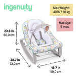 The best-selling Ingenuity Keep Cozy Baby Bouncer, Seat & Infant to Toddler Rocker grows with baby to be enjoyed for years. A new parent “must-have” with over half a million units sold, this versatile baby rocker and bouncer from the #1 manufacturer of bouncers is designed in the USA and gives you a second set of hands while baby sits comfortably in your sight. Third party tested and approved, the Keep Cozy features 3 modes in 1: bouncing, rocking, or convert it to a stationary seat for your toddler with the kickstand at the rear. Packed with features like soothing vibrations powered by 1 C battery (not included), two reclining positions for baby’s comfort and a removable infant bolster that helps newborns sit securely. Includes a detachable plush lion hanging toy for playtime at home or on the go. Neutral design blends into any home décor. Seat pad and bolster are machine washable. Accommodates children up to 40 pounds and makes a great add to your baby registry. Assembled dimensions are 23.62" (H) x 19.69" (W) x 28.74" (L). This is the #1 bouncer, Circana, Retail Tracking Service, Bouncers, U.S. dollar sales, January-November 2023 combined.