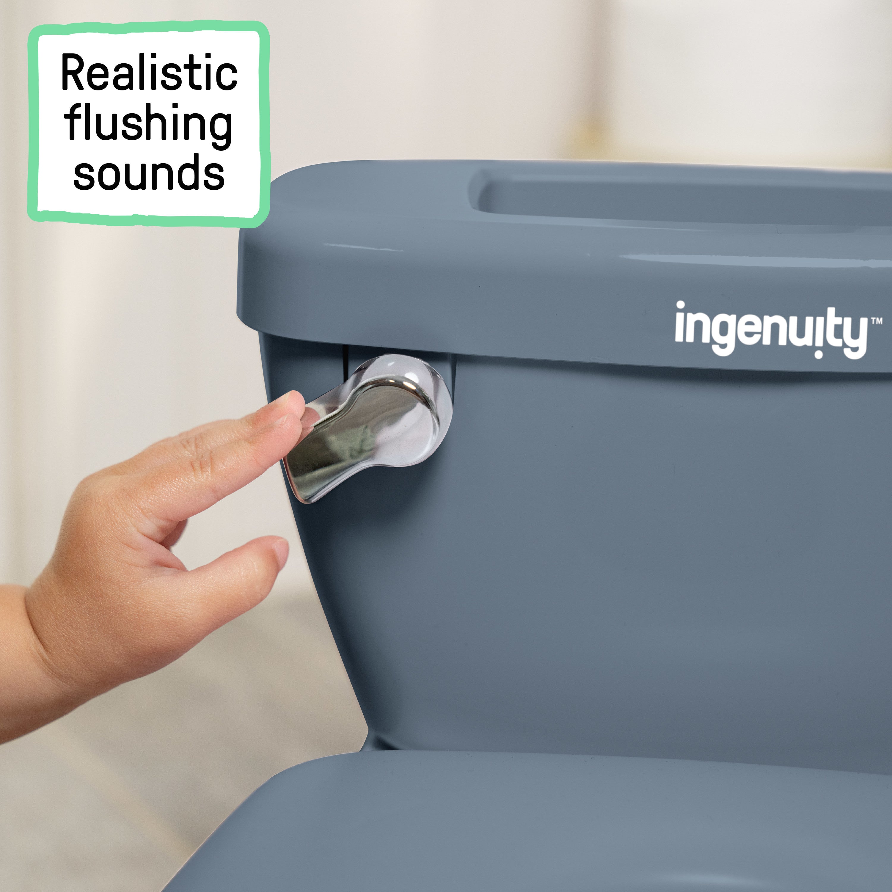 Potty training is easier (and more fun) with the #1 Ingenuity My Size Potty Pro*. Designed by the #1 Manufacturer of Potties* to look and feel like a real adult toilet, the original My Size Potty Pro is a top-rated toddler floor potty that helps to ensure a comfortable and confident progression to the real thing. Named the Best Potty Training Toilet in the 2023 Best of the Bump Awards, this toilet features a chrome-style toddler potty handle that makes a realistic flushing sound to reward your little one for a job well done. A removable potty topper can be used as a toddler toilet seat on an adult toilet to help your toddler become a potty training pro. A built-in storage compartment is spacious enough to hold books, a tablet, wipes, or anything else your little one needs to promote healthy habits during the potty training process. With a removable bowl and integrated splash guard, the My Size Potty Pro is easy to clean – perfect for all of toilet training’s messy moments. The assembled dimensions are 11.8" (H) x 10.5" (W) x 14.1"(L) . Incudes 2 AAA batteries. For children ages 18 months and up, with maximum weight of 50 pounds. #1 Potty * (*Circana, US Dollar Sales, Jan-Dec ‘24)