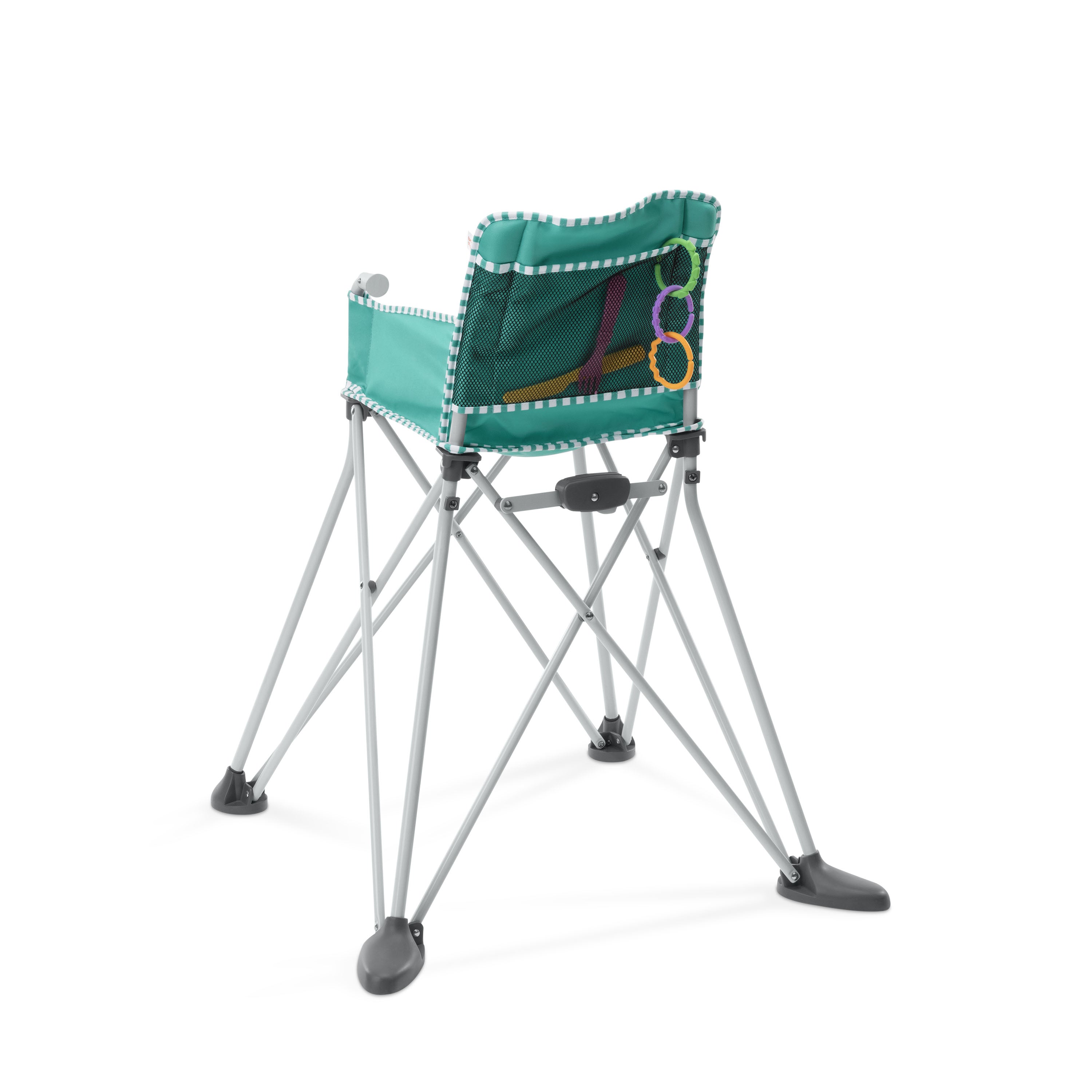 On-the-go mealtime just got easier with the original Pop ‘N Dine from Bright Starts. From sideline snacks to messy meals, this indoor and outdoor portable high chair will give you peace of mind with its easy-clean design, removable tray, and rear pocket. When your little one gets hungry, whether at a restaurant, grandma’s house, or just in the backyard, the Pop ‘N Dine easily unfolds (and folds back up) in seconds. Designed for ages 6 months+ and up to 45 pounds, you’ll get lots of use out of this versatile high chair that keeps baby or toddler secure with a 3-point adjustable safety harness. The wipeable, easy-clean fabric and dishwasher-safe tray with cup holder mean you can enjoy the moment and minimize cleanup. The rear storage pocket is perfect for holding snacks, wipes, and more. Assembled dimensions: 24”L x 24”W x 32.75”H. Gender neutral teal color.