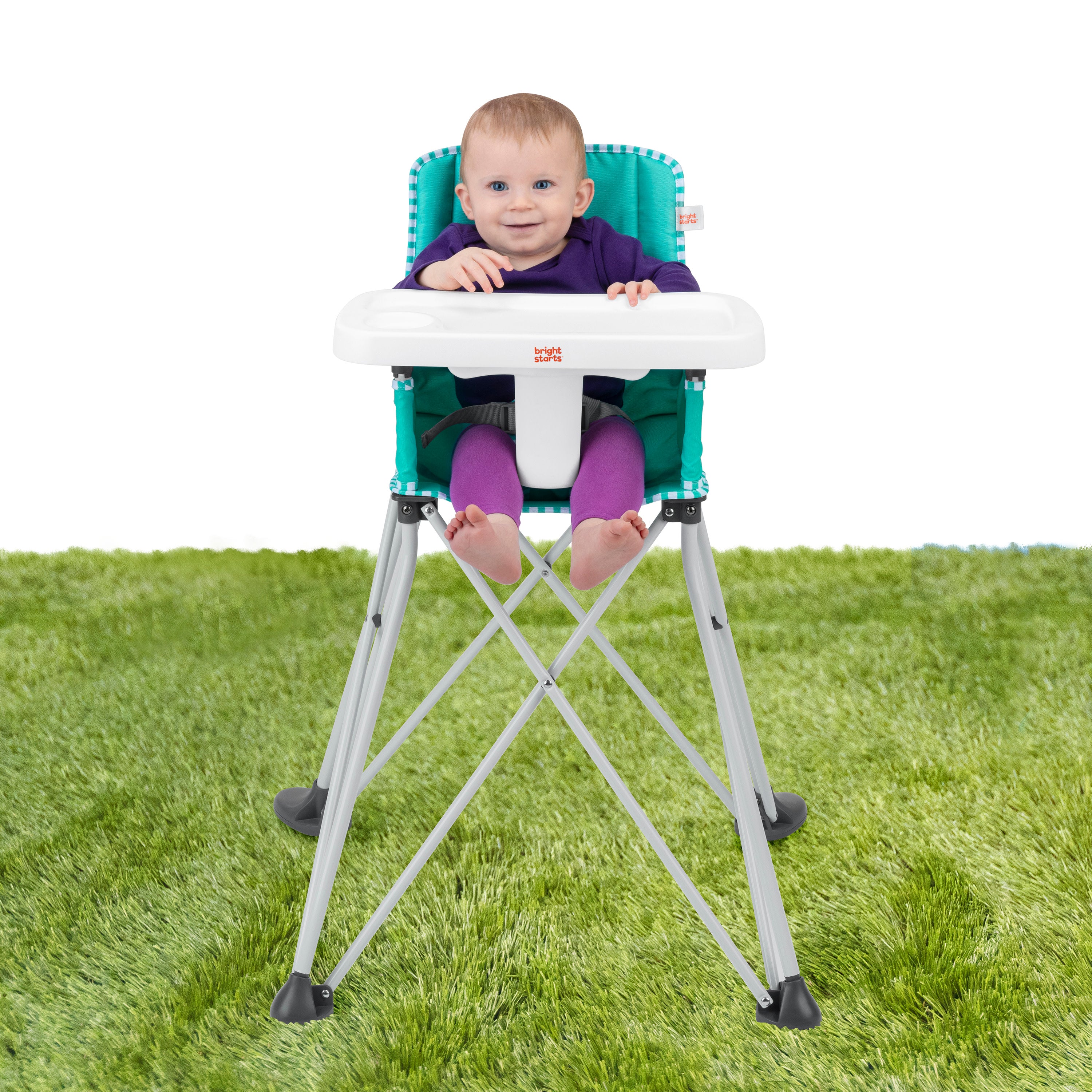- Bright Starts Pop ‘N Dine portable high chair makes on-the-go mealtime a breeze, from restaurants to the backyard to family travels; made for indoor/outdoor use