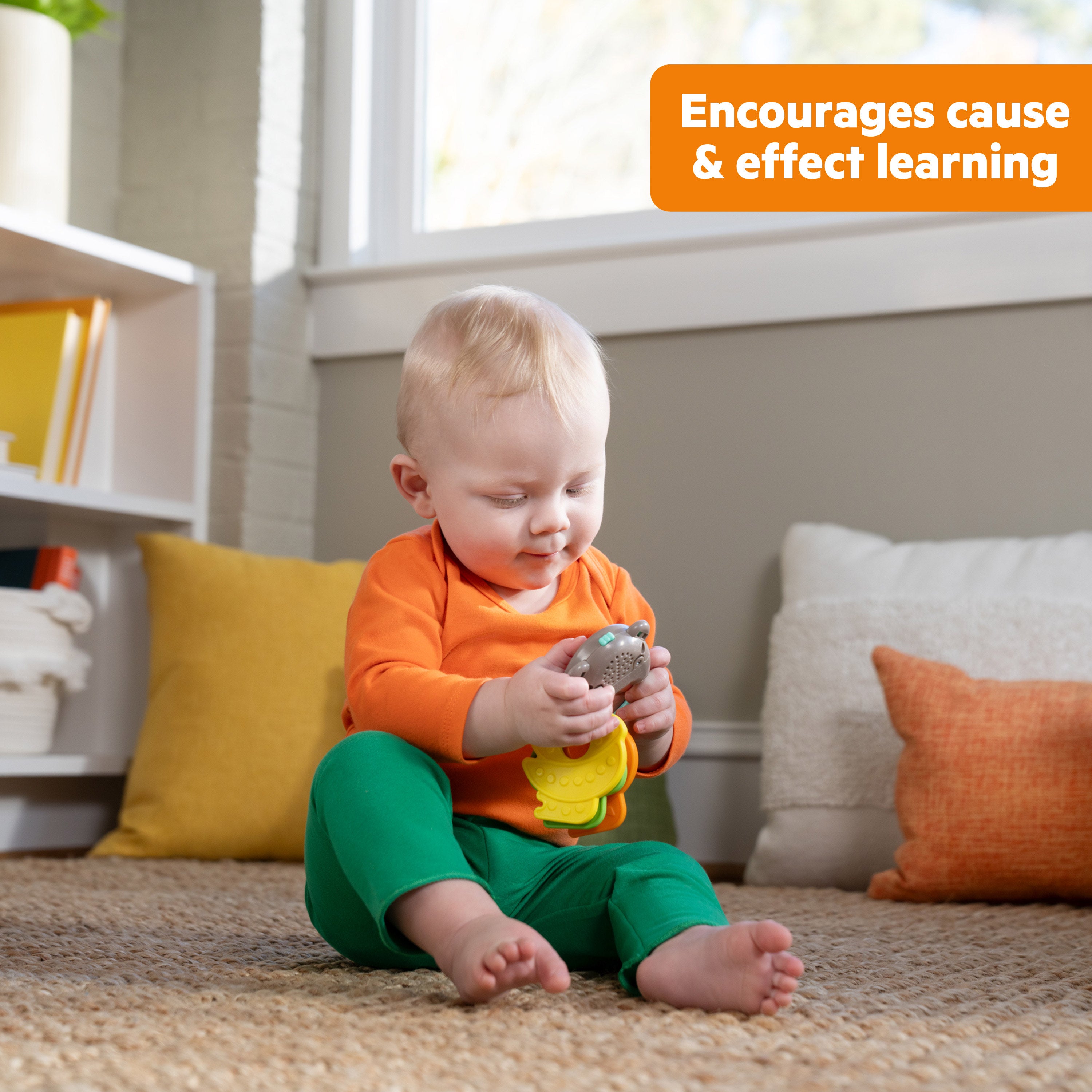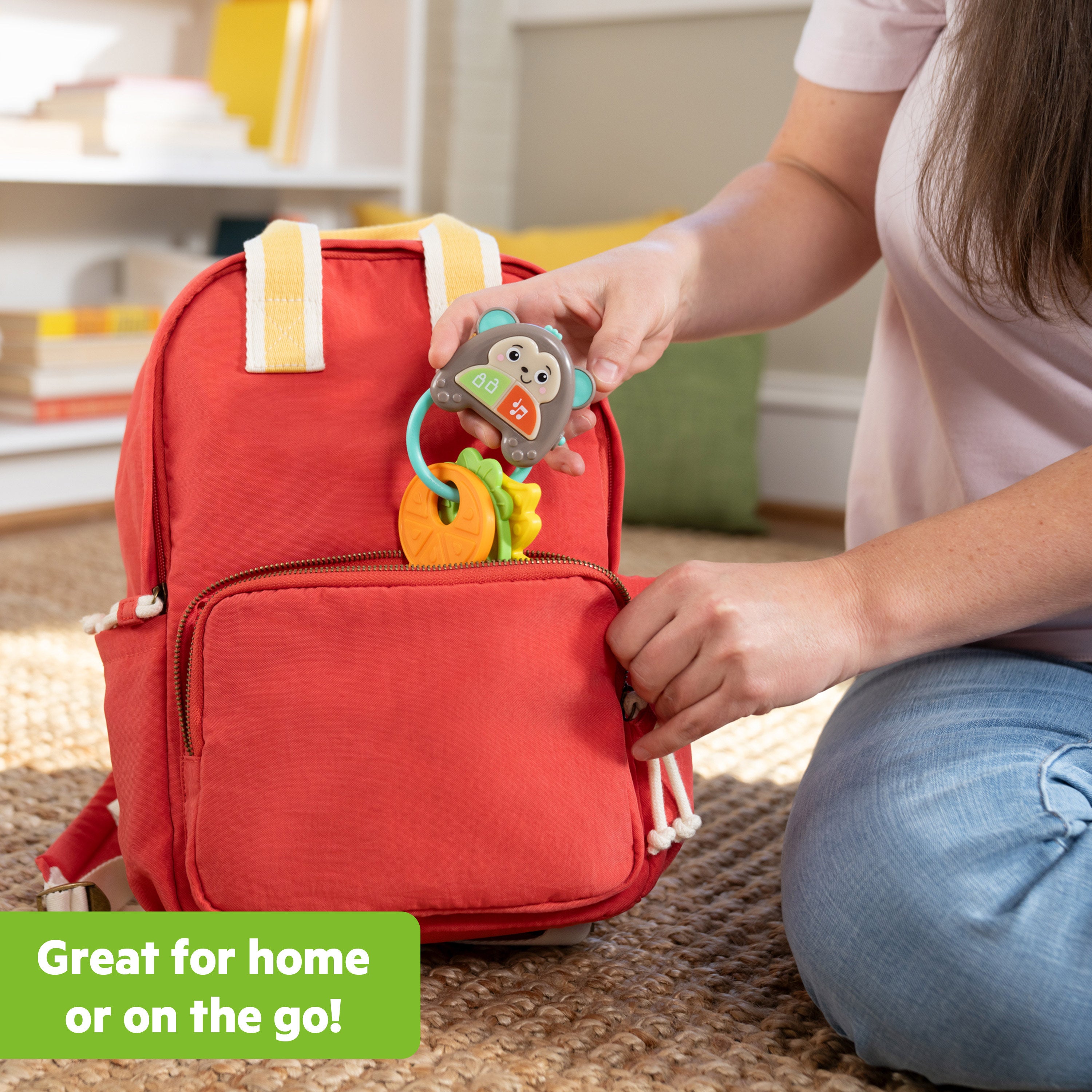 - Includes 3 textured, fruit-shaped toy keys that provide additional tactile stimulation; colorful keys and adorable monkey character brighten baby’s day