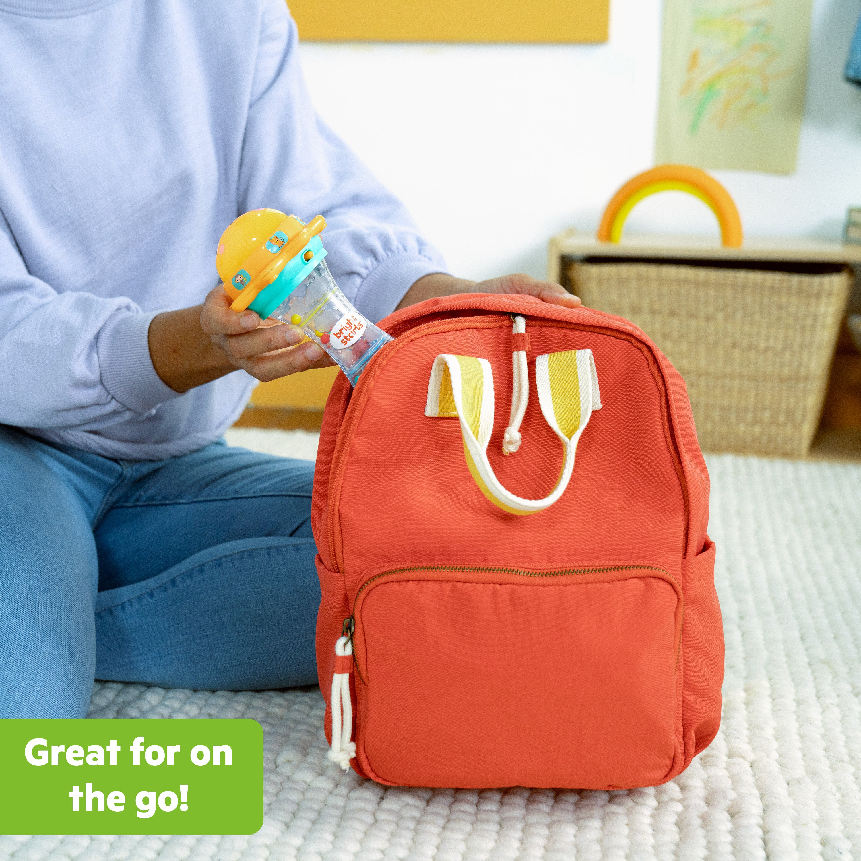 - Bring this sweet baby toy on the go, so your little ball of sunshine can play and learn wherever you are; fits in most diaper bags