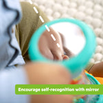 - Encourage self-recognition with the surprise mirror on the bottom of the toy; teach cause-and-effect when baby rotates and shakes the toy