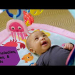 Give baby an ocean of fun with the Baby Einstein Ocean Explorers 4-in-1 Kickin’ Tunes Jellyfish Jamboree Music & Language Discovery Gym in Pink. From the #1 Manufacturer of Play Gyms*, this musical gym engages baby with 25+ minutes of continuous lights and transforms 4 ways to grow with baby from ages 0 to 36 months. 4 play modes: lay and play, tummy time, seated play, and on the go. Baby will love to explore the 2 toy bars and a kick piano with 3 modes of learning and play. As baby grows, flip the piano up to use for seated play, or detach to take on the go! Magic Touch surface helps the piano respond to every kick, tap, and press so baby can make music easily! Parents love that this unique gym supports baby's visual development and fine and gross motor skills. The piano features 90+ engaging melodies and sounds and teaches colors, shapes, and numbers in 4 languages (English, Spanish, French, & German). 7 toys encourage reaching and sensory engagement. Prop pillow gives baby extra support during tummy time. (*Circana, US dollar sales, Jan-Oct 2023). Dimensions: 18 x 34 x 27 inches. Requires 3 AA batteries (not included). Machine washable mat. Toys wipe clean.